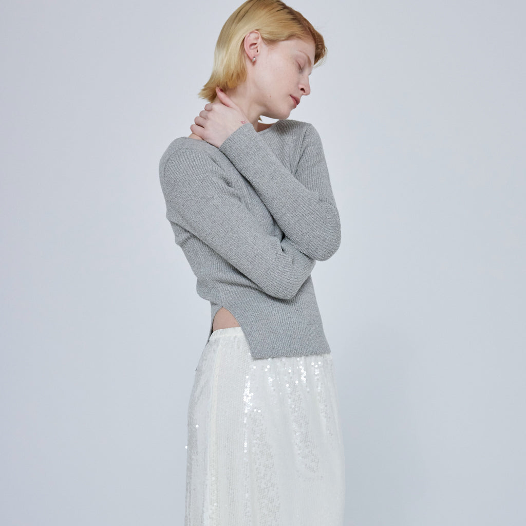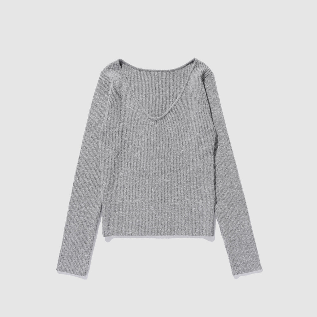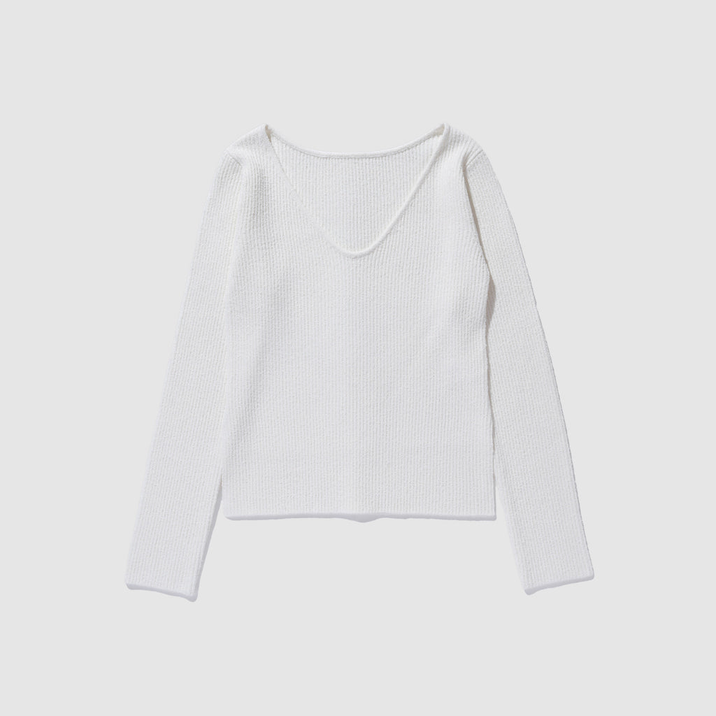 From the popular boucle knit series, this lightweight knit top features a side slit. It can be worn front or back, allowing you to enjoy different outfits by changing the neckline.