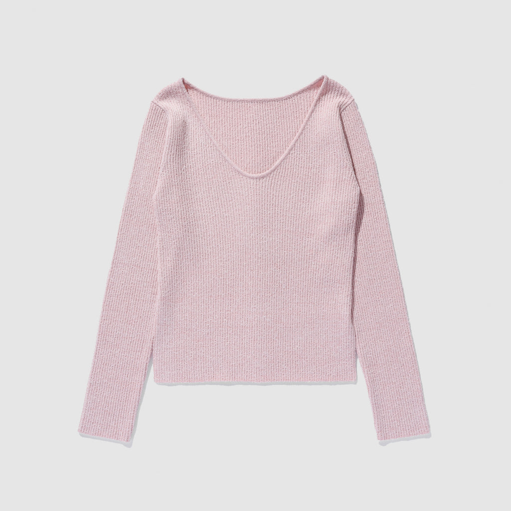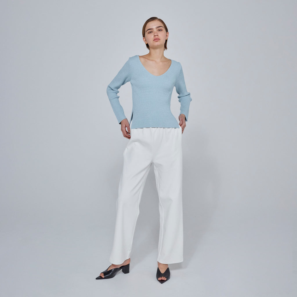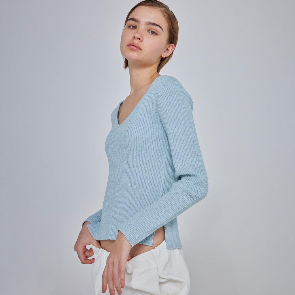 From the popular boucle knit series, this lightweight knit top features a side slit. It can be worn front or back, allowing you to enjoy different outfits by changing the neckline.
