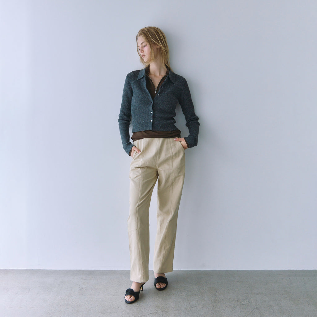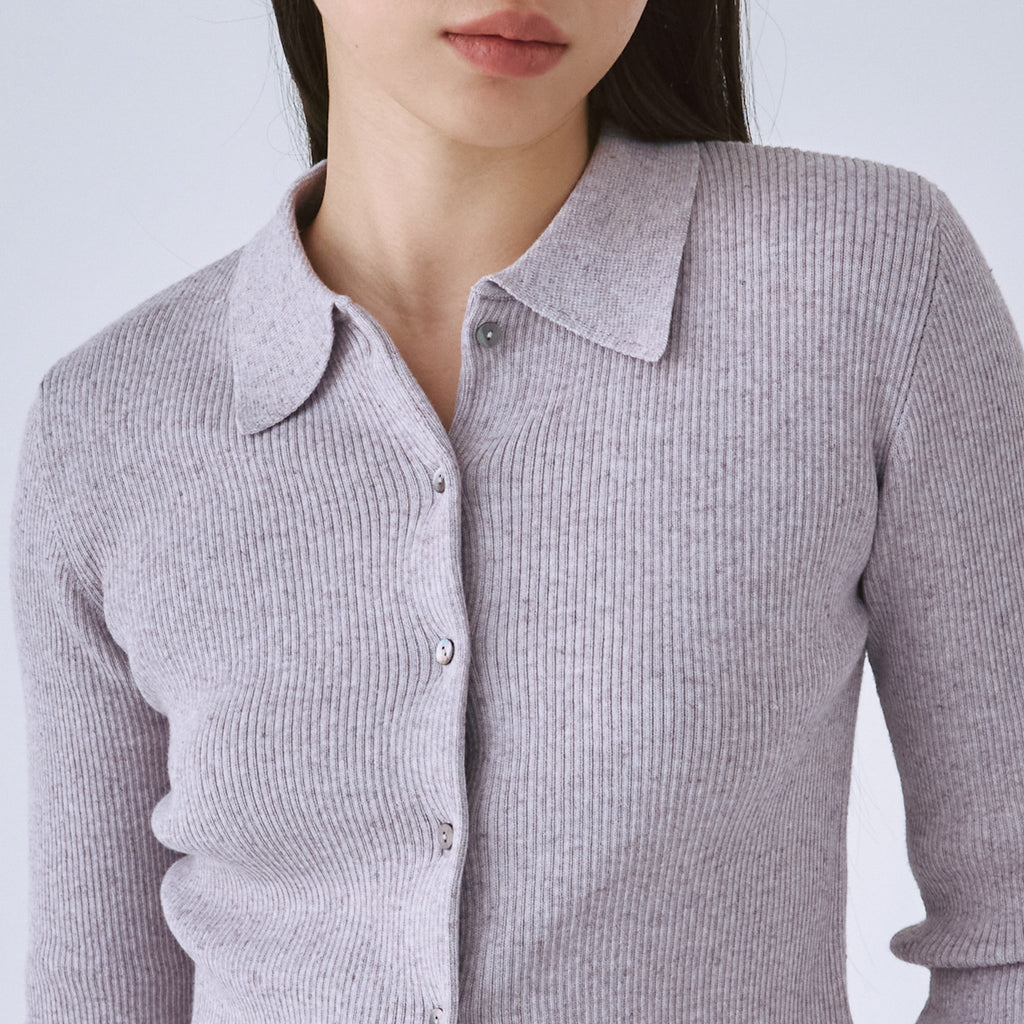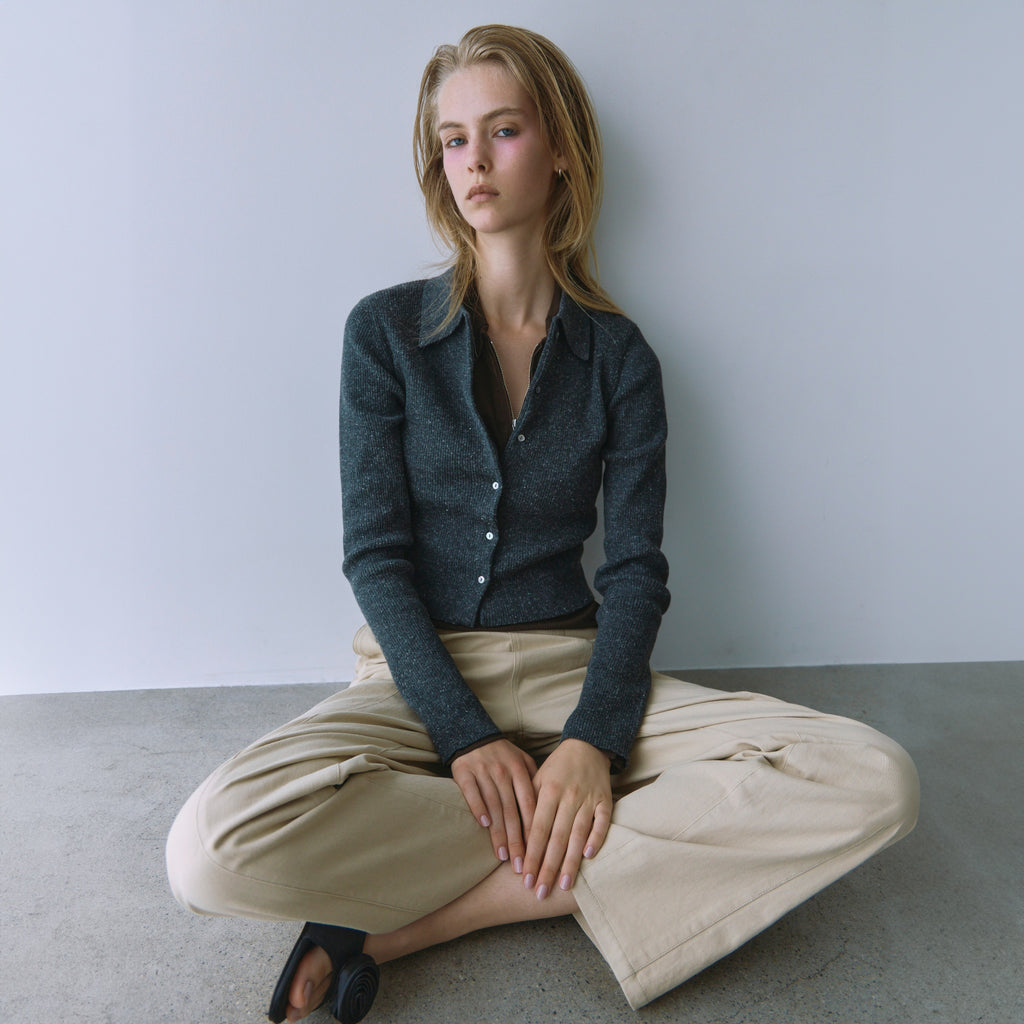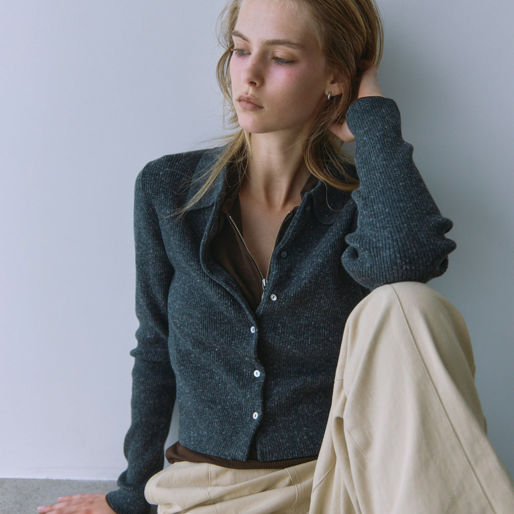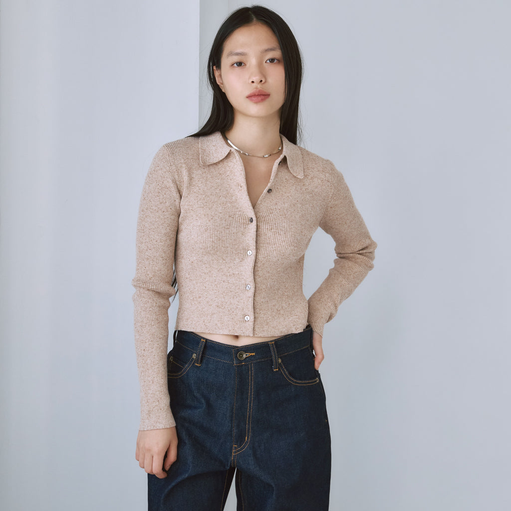 The popular "Linen Combi" series is back in stock with a compact collared cardigan in new colors, "Heather Mocha" and "Bordeaux." The clean, seamless design is the highlight. Its appeal lies in its long-lasting basic design.