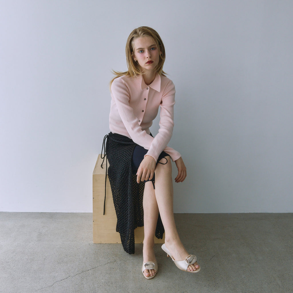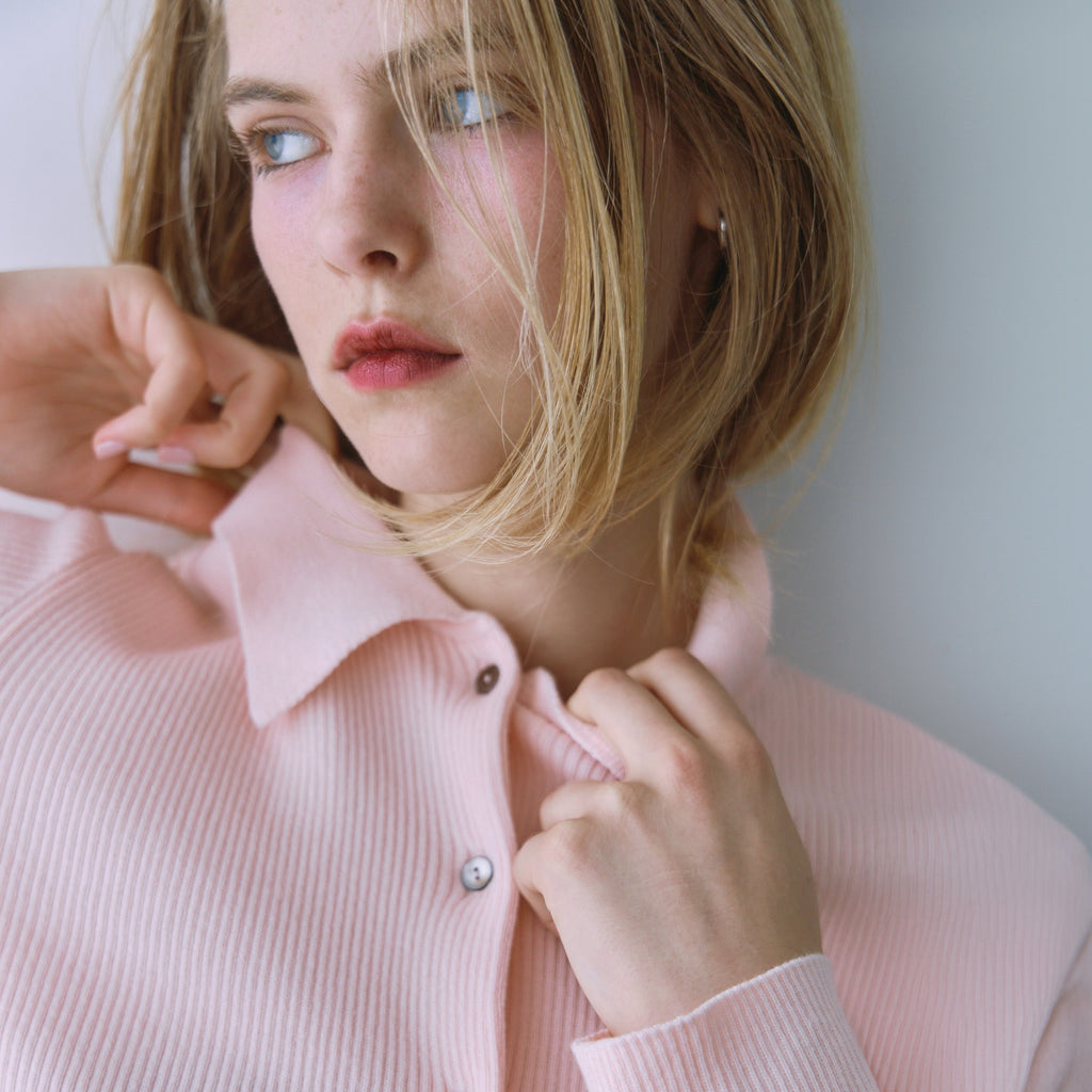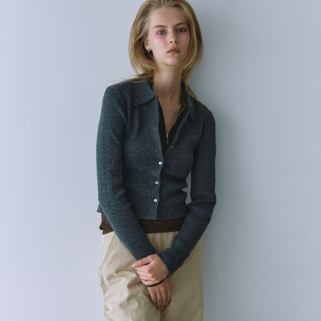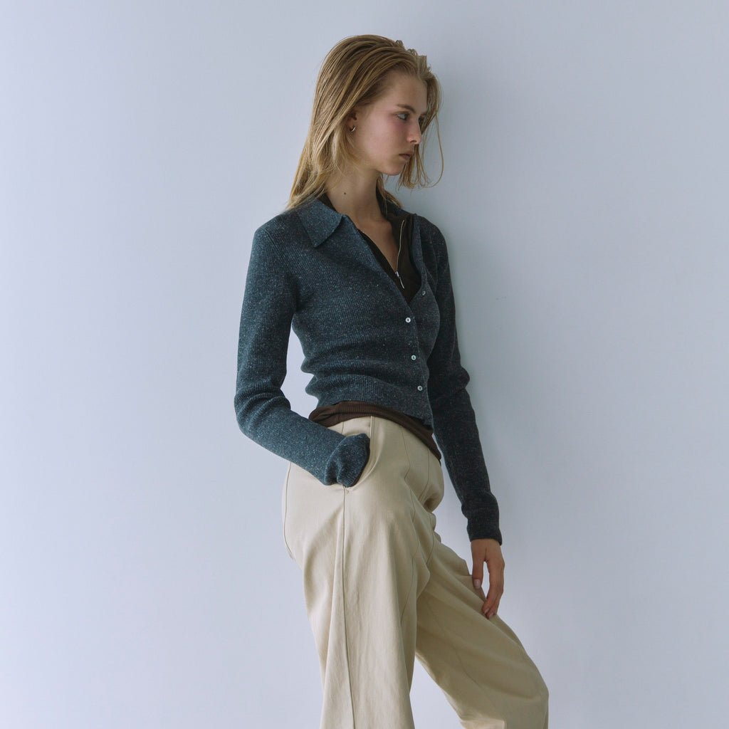 The collar is made of a flat knit fabric, creating a contrast with the ribbed knit of the body. The shape of the collar was revised many times to create this item.
