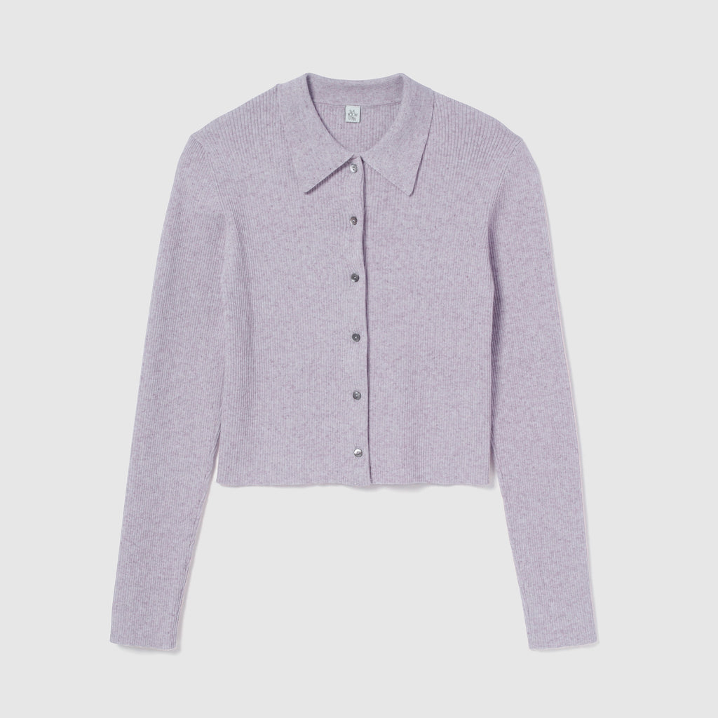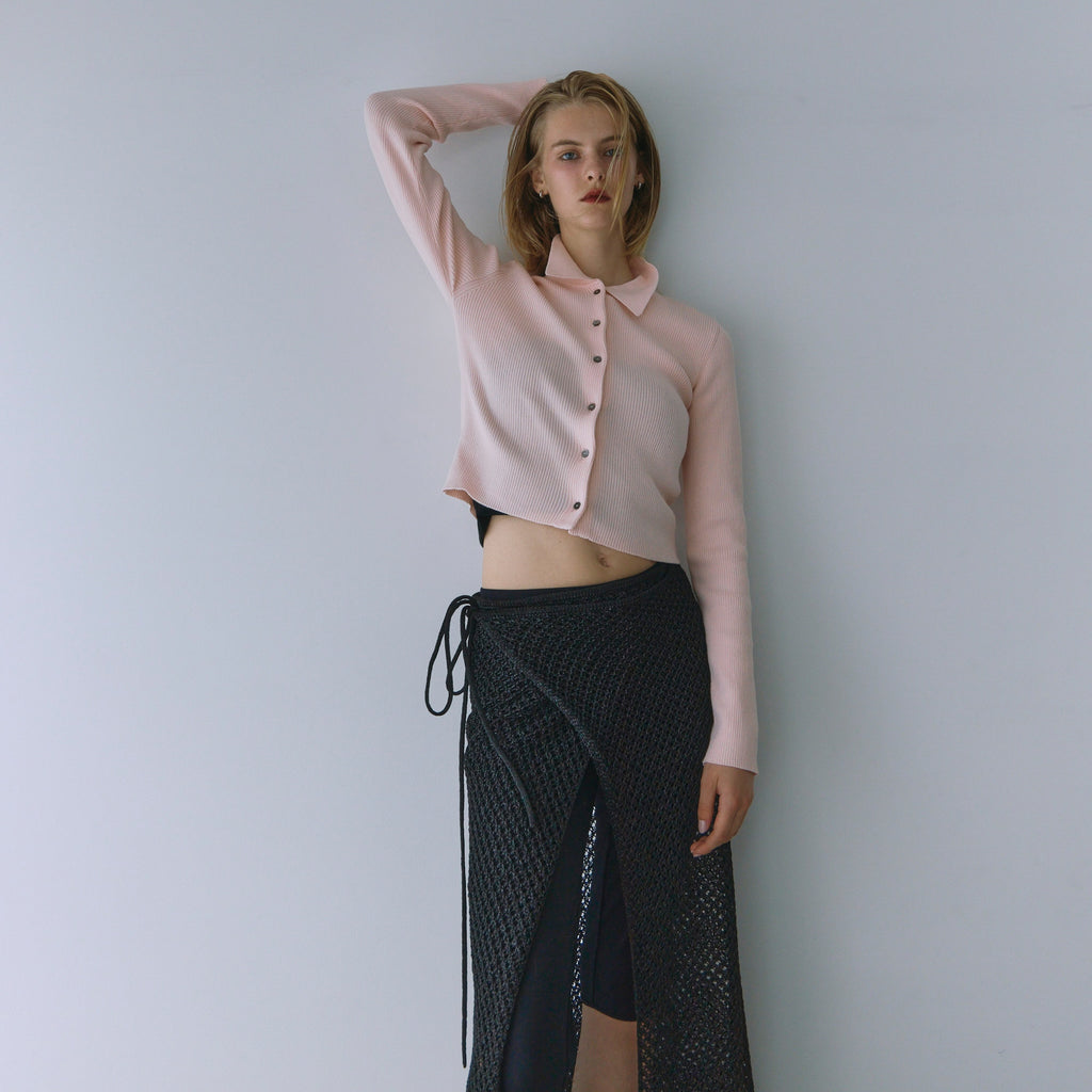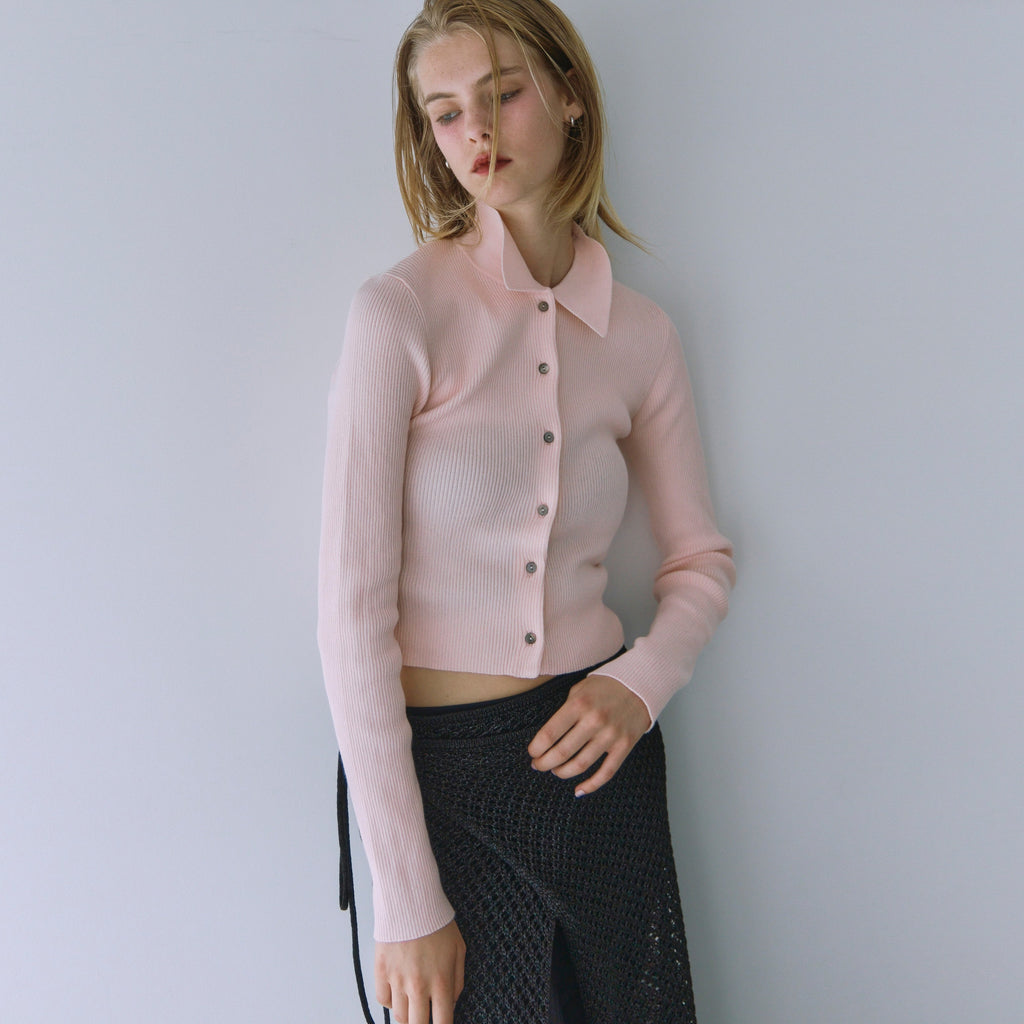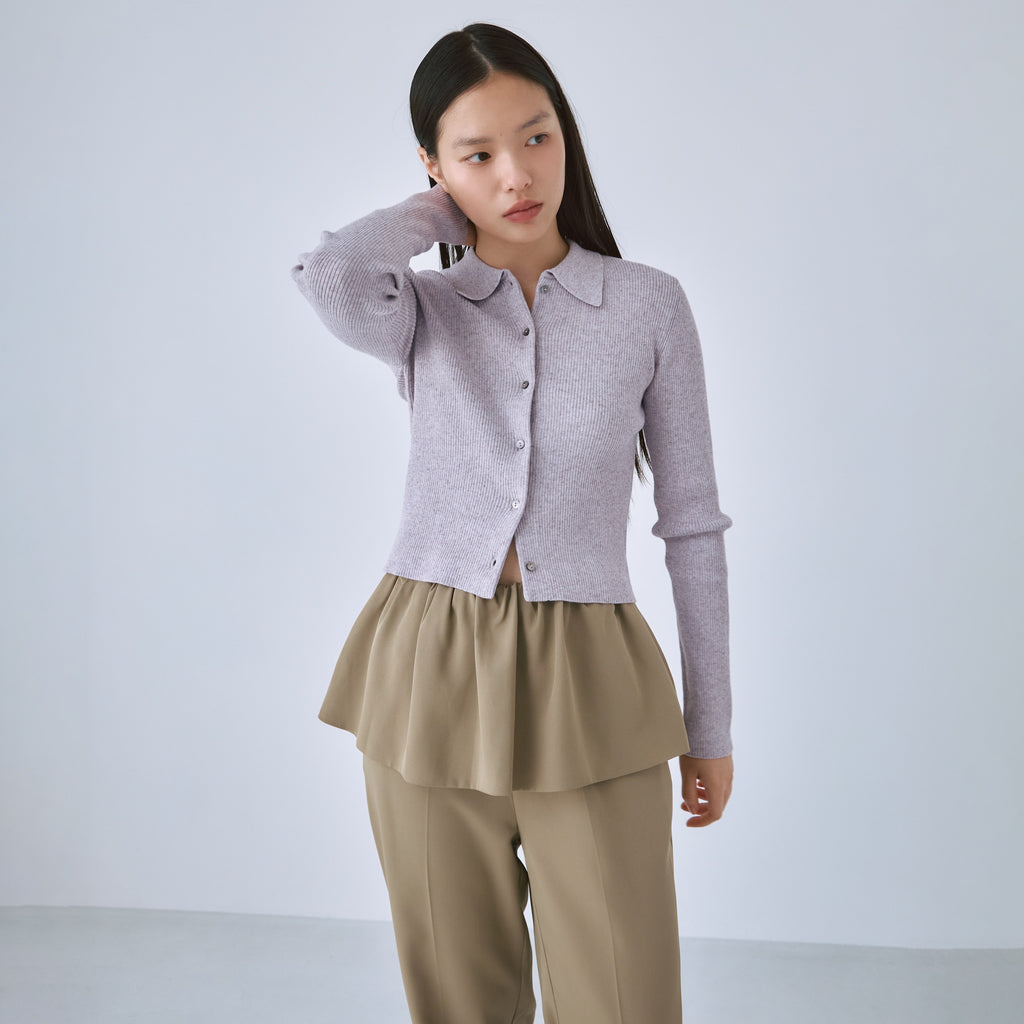 The collar is made of a flat knit fabric, creating a contrast with the ribbed knit of the body. The shape of the collar was revised many times to create this item.