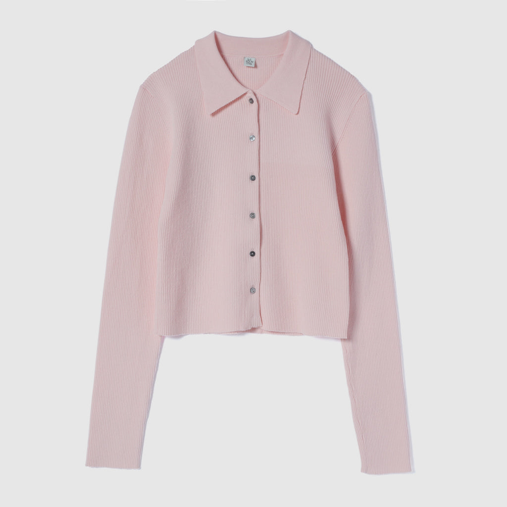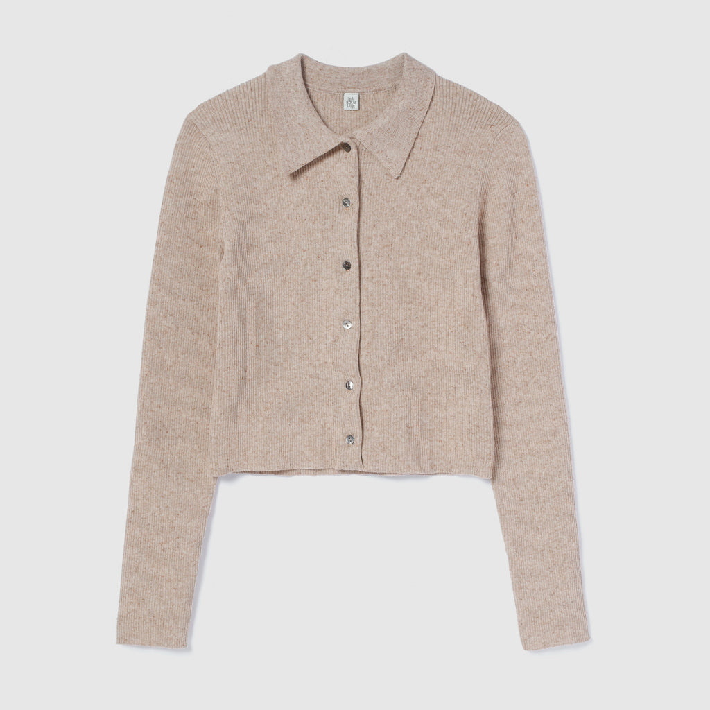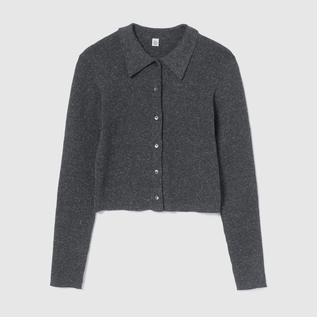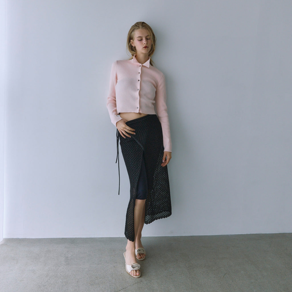 The collar is made of a flat knit fabric, creating a contrast with the ribbed knit of the body. The shape of the collar was revised many times to create this item.