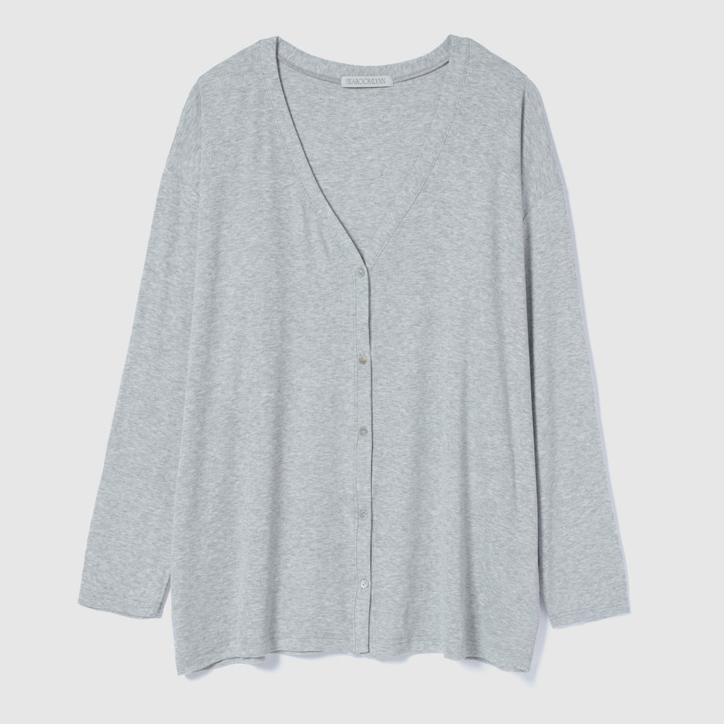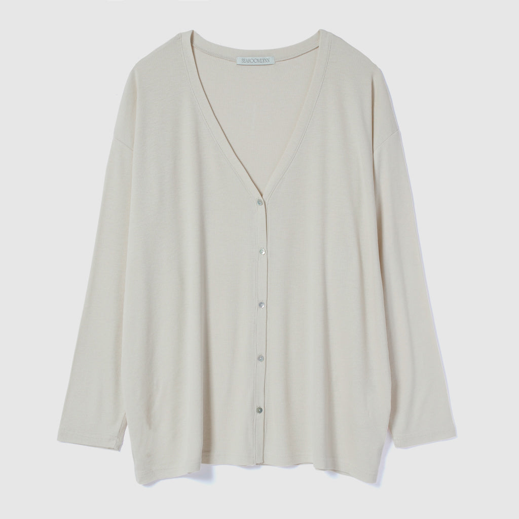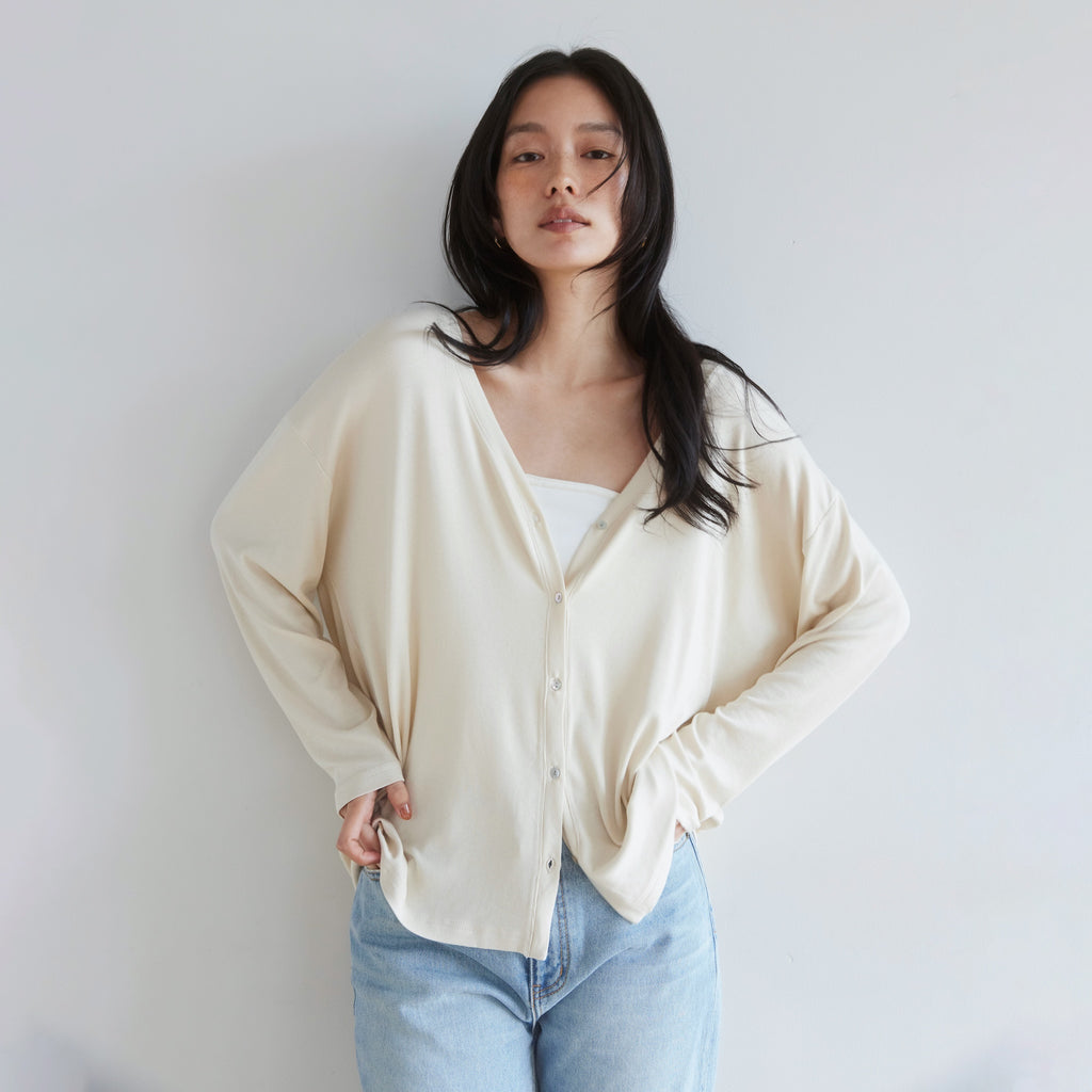 The deep V-neck adds a casual feel, and the small shell buttons add a subtle accent.