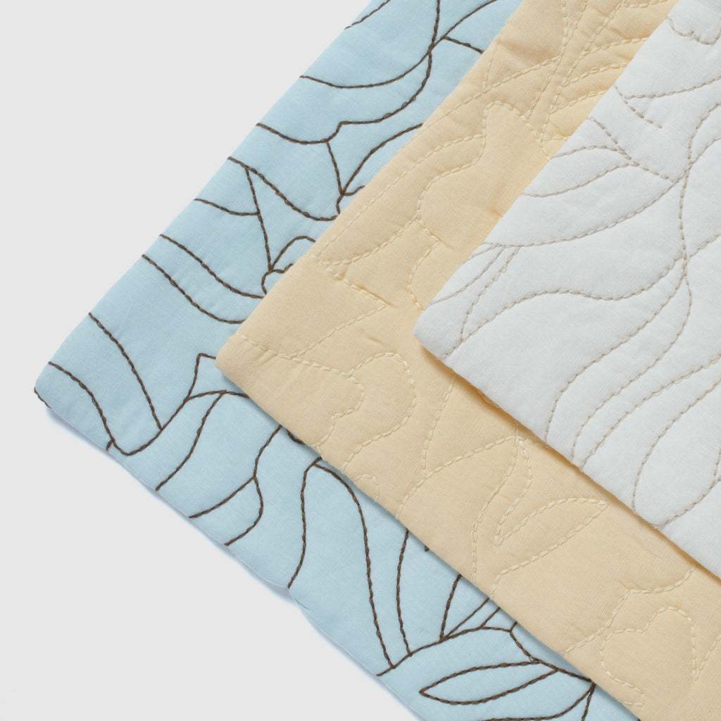 A refreshing cotton-based fabric. Quilted with a small amount of padding between the outer and inner lining to create a firm and three-dimensional look. Thin and light, it looks cool even in summer.