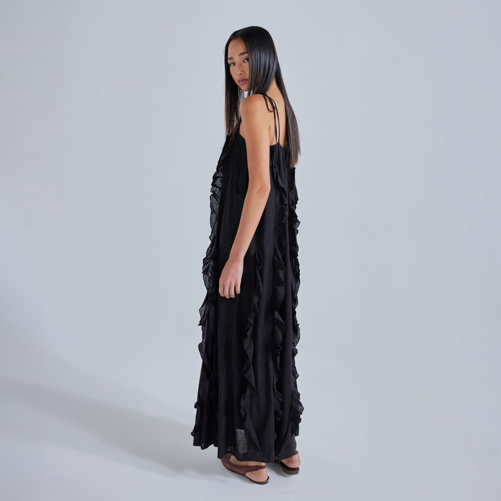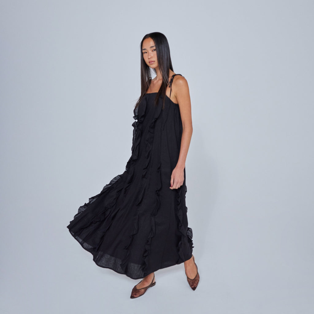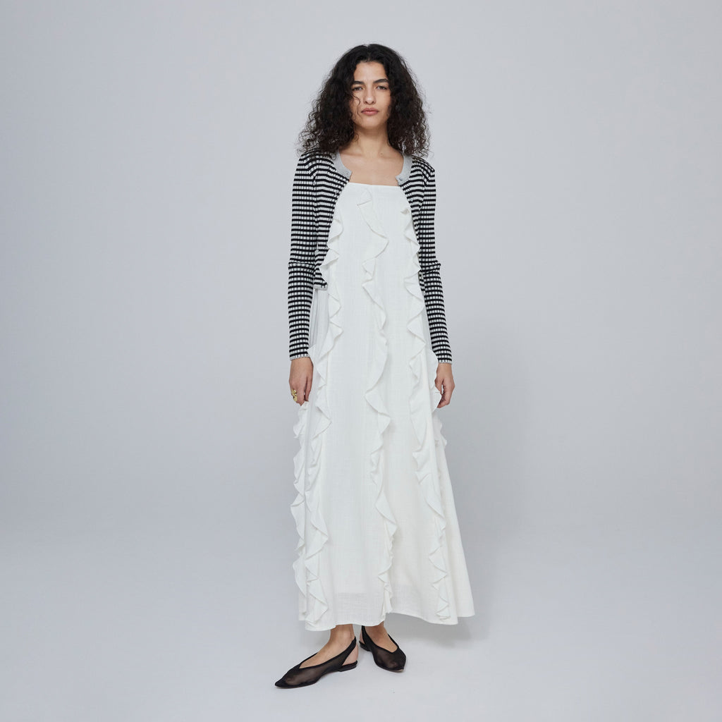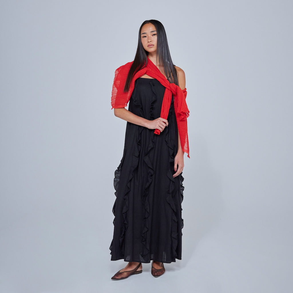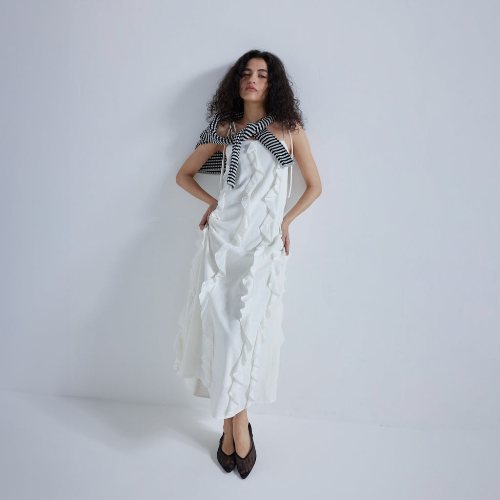 The A-line silhouette widens towards the hem. This dress is decorated with ruffled frills all over, resembling fish fins. The light design undulates with every movement.