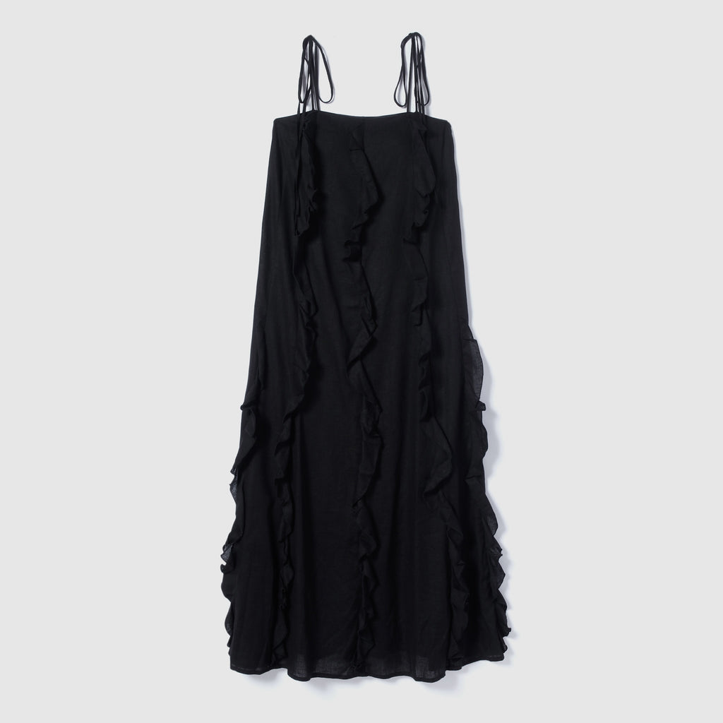 This dress is full of this year's trends, with linen fabric and ruffle frills. It's a stand-out piece, so you won't have to worry about coordinating it with other items. It's ladylike, but the calm colors give it a mature feel.