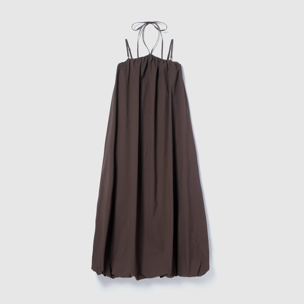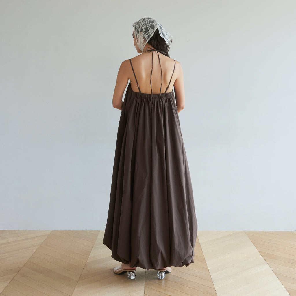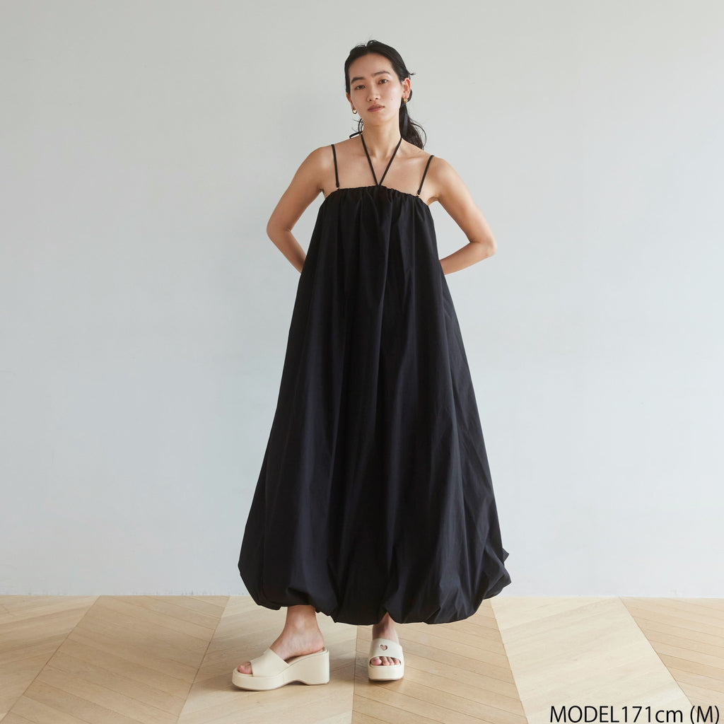 A cute balloon dress with a voluminous feel made from firm fabric. The halter neck and side strings create a delicate strap look.