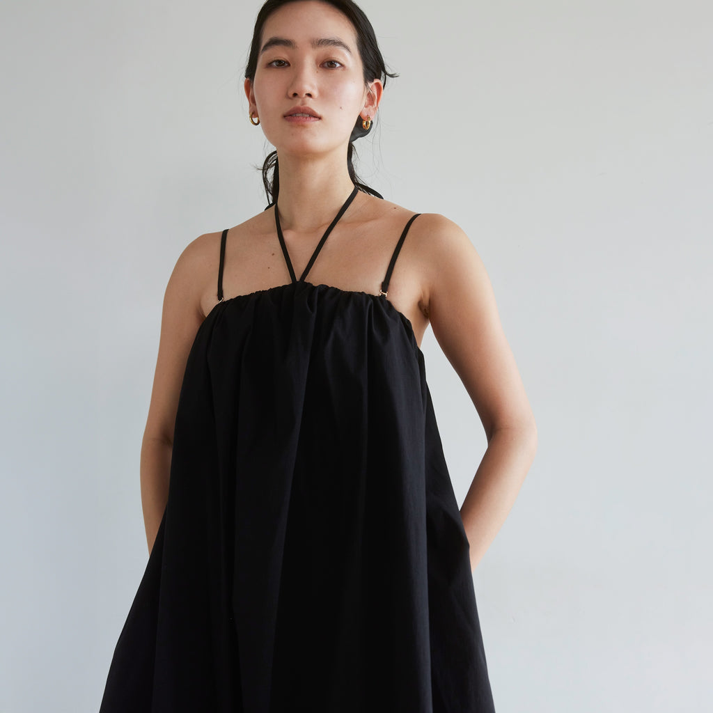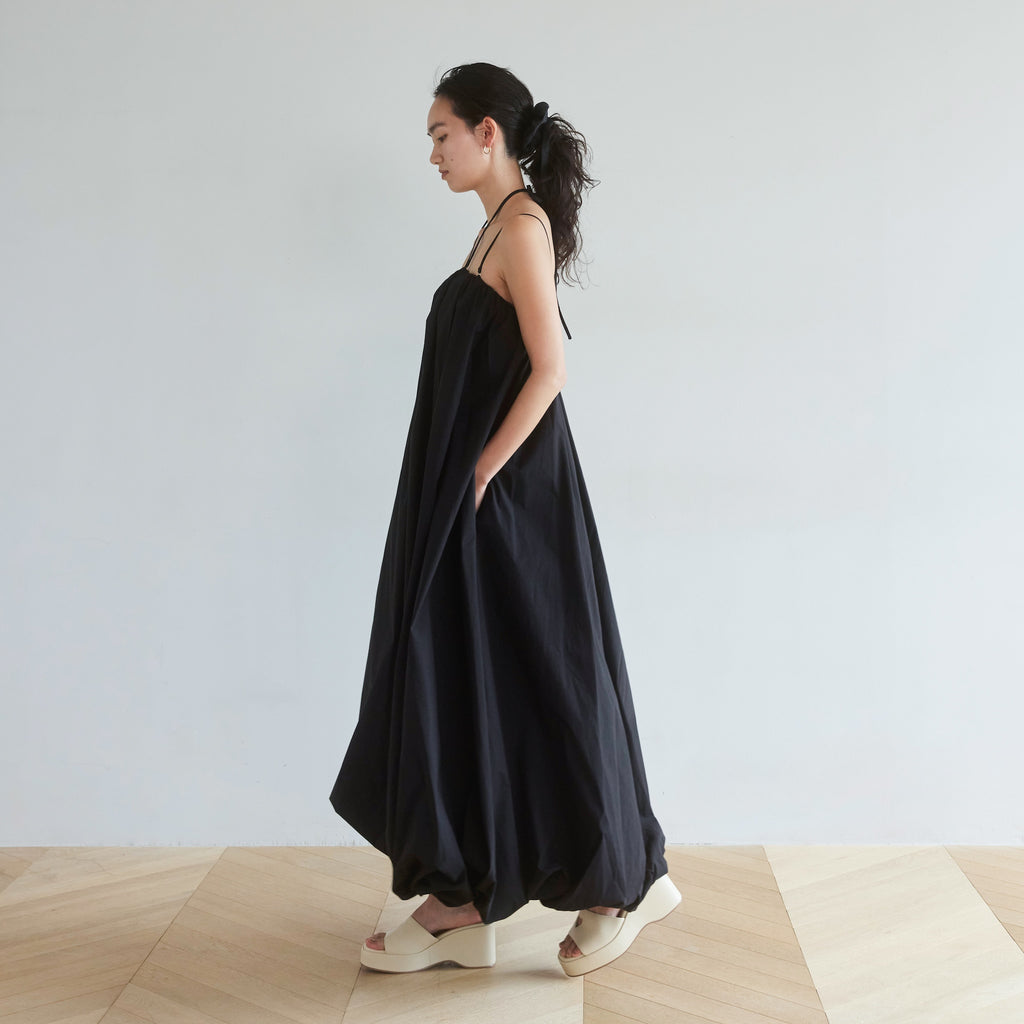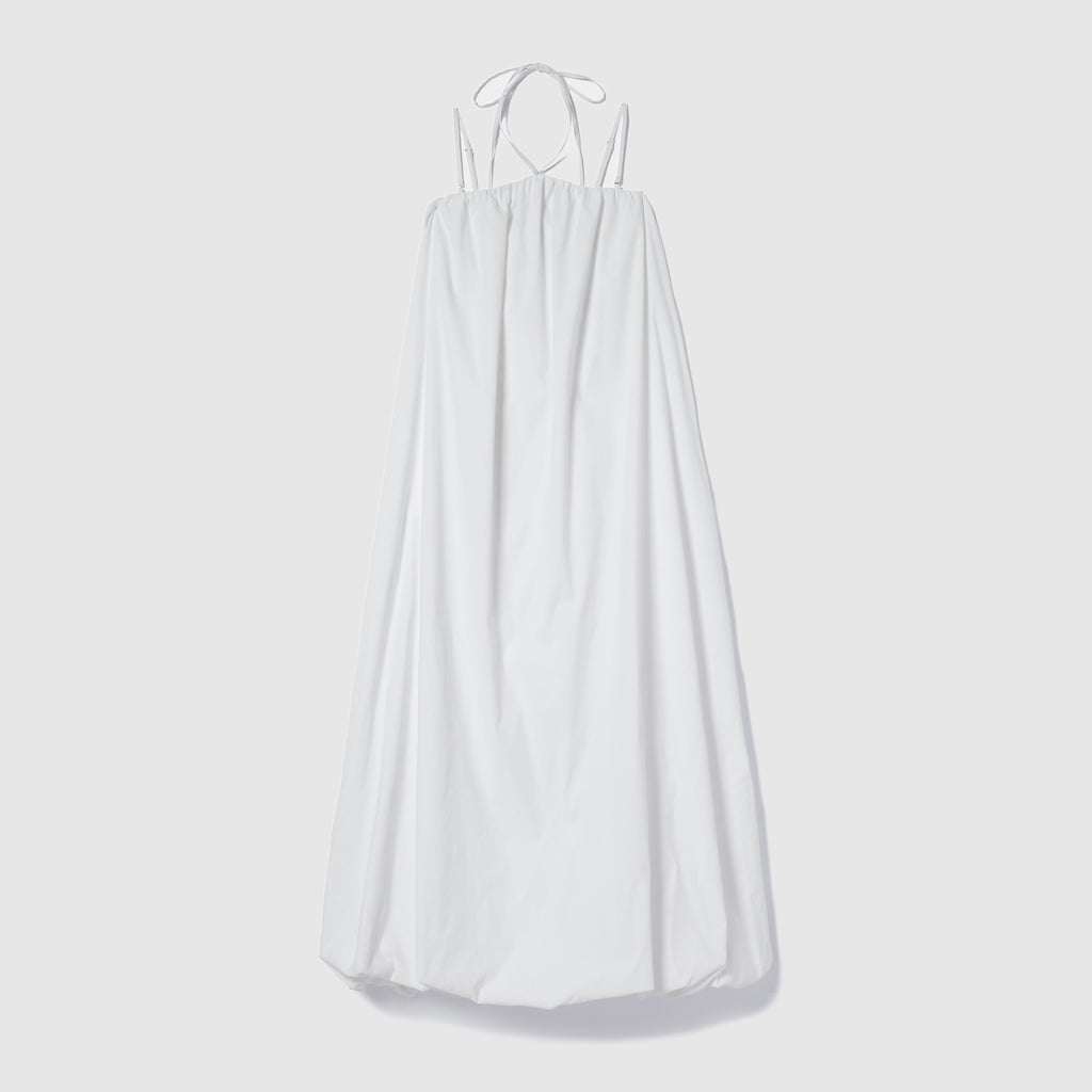 A cute balloon dress with a voluminous feel made from firm fabric. The halter neck and side strings create a delicate strap look.