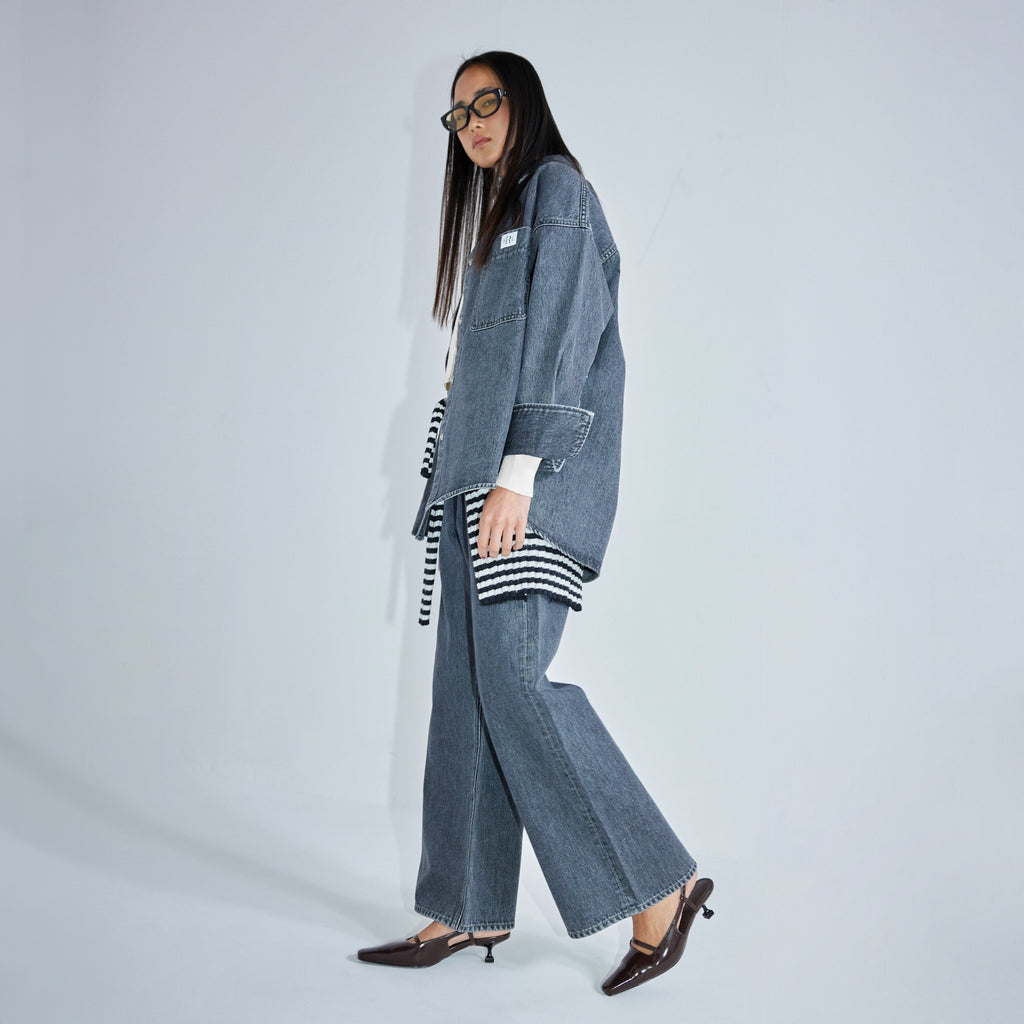 "Blue" is a smooth 12.5oz denim. It is a beautiful fabric with three-dimensional grain and vertical fading. The vivid blue stands out with its worn-in look and processing. "Washed Gray" is a fabric with black warp and white weft. It is not pure black, but has been processed to have a denim-like gray color to express the worn-in look of repeated wearing and washing.