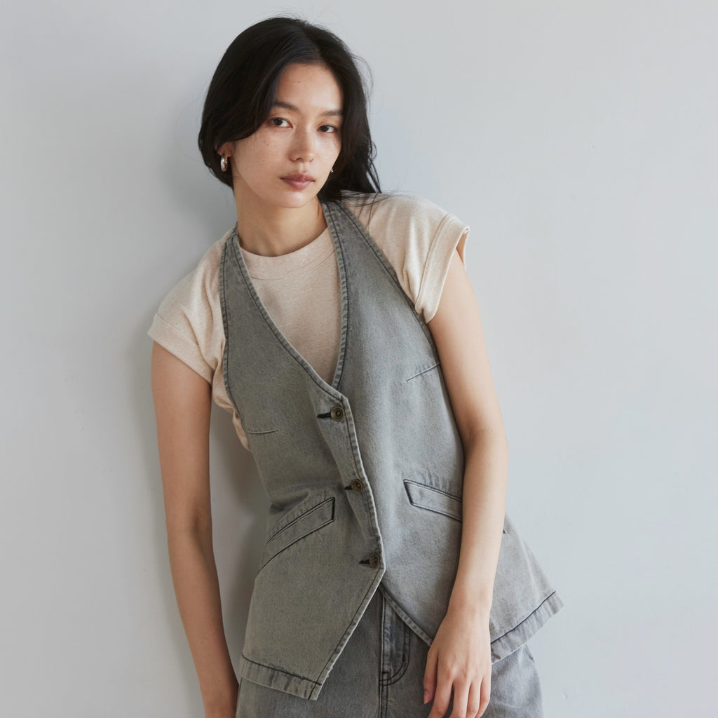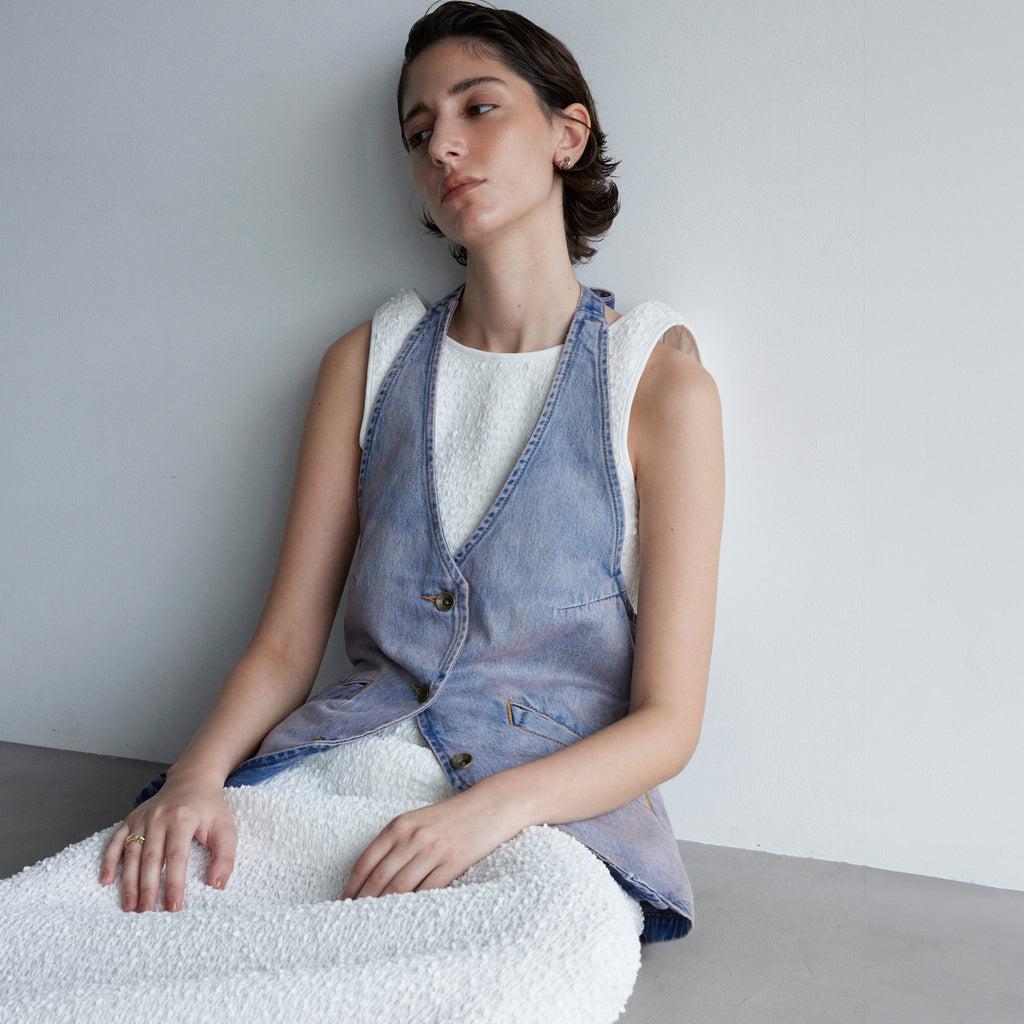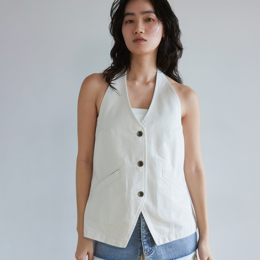 The popular halter neck design vest is back. A new color, "blue pink," has also arrived. The V-neck and open back add a casual feel to the denim so that it doesn't look too heavy. Enjoy a sophisticated new look.