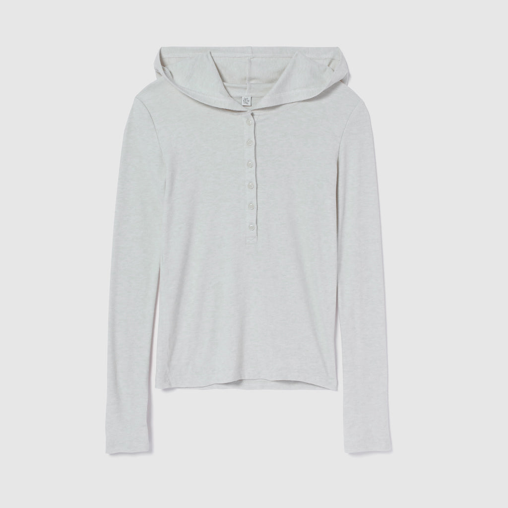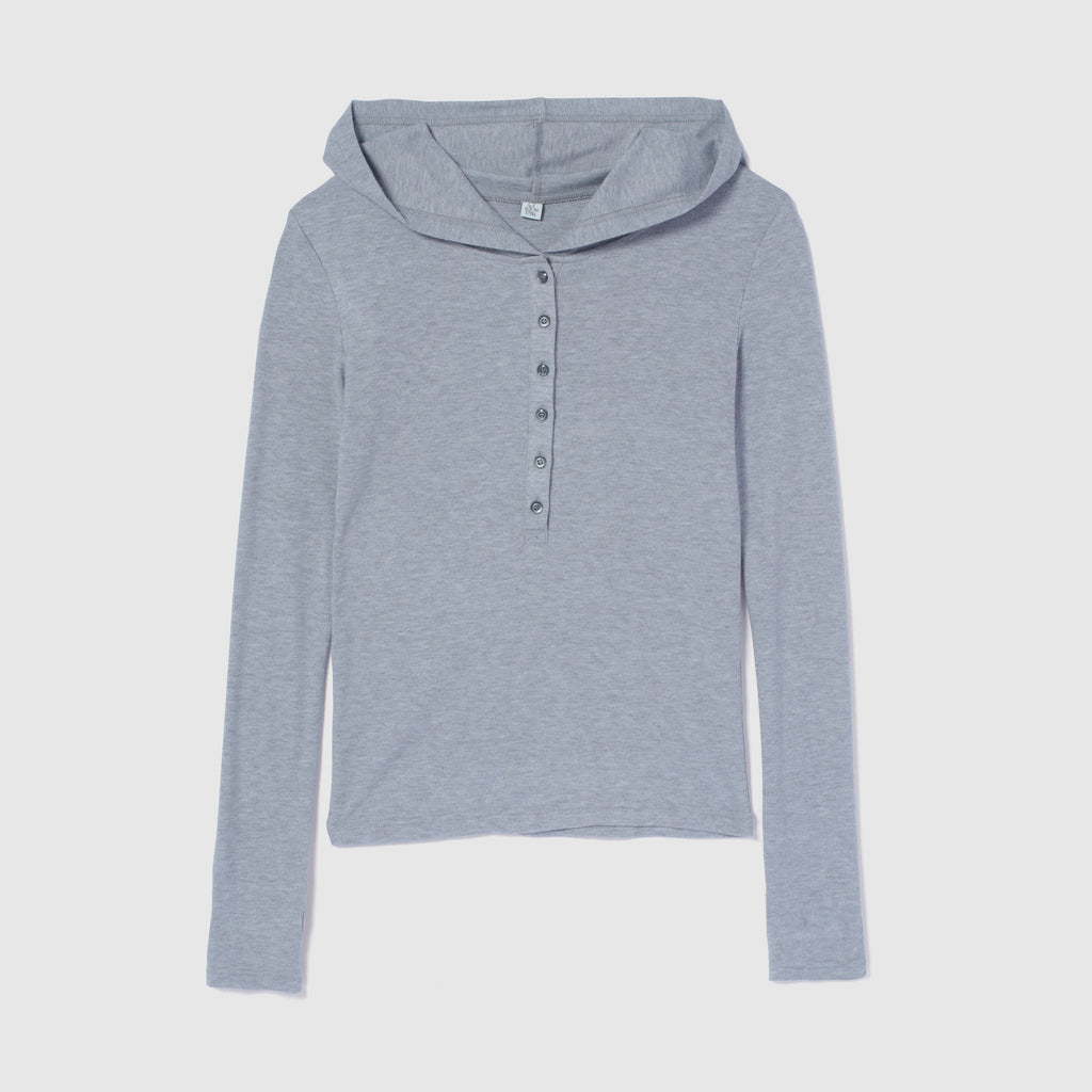A top with a Henley neck design that brings the trendy hoodie into adult casual style.