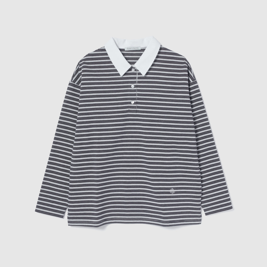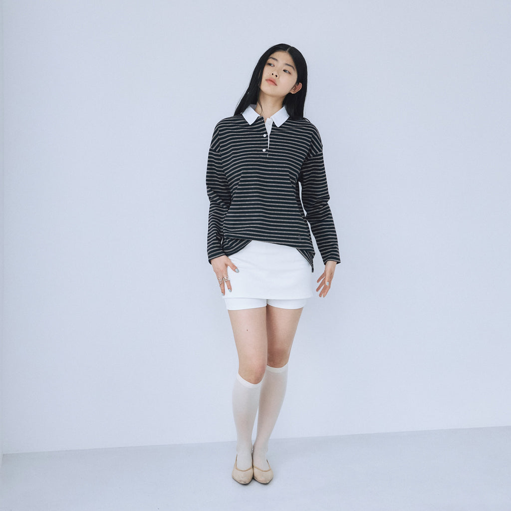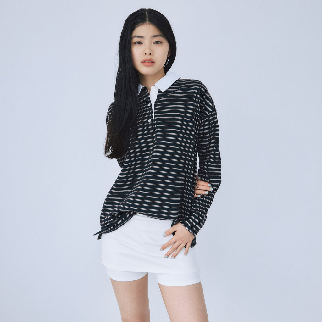 The collared rugby shirt design is combined with random borders to create a look that is both sporty and elegant.