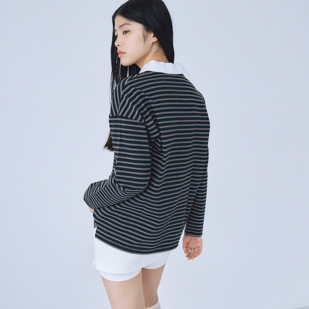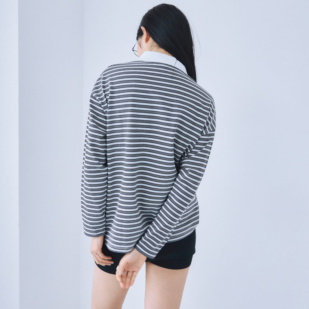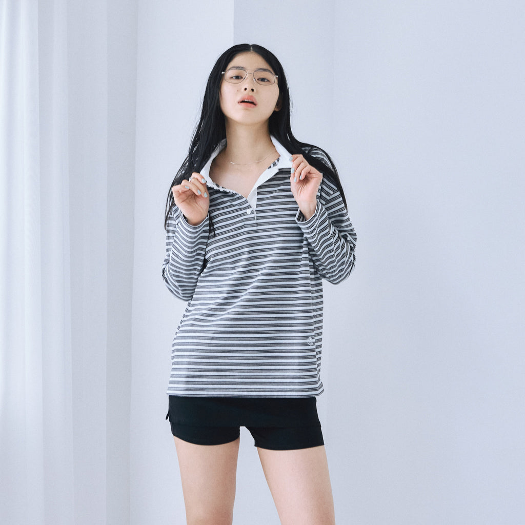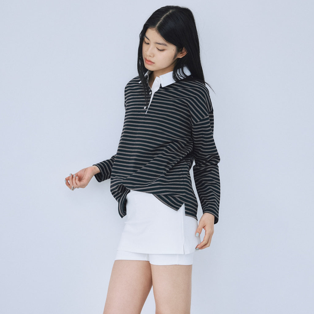 The collared rugby shirt design is combined with random borders to create a look that is both sporty and elegant.