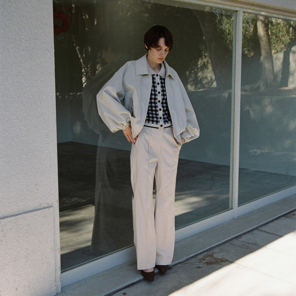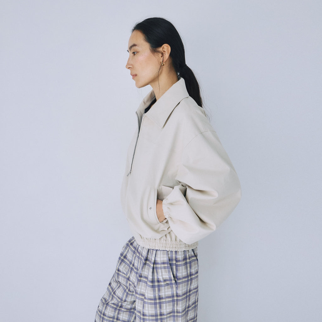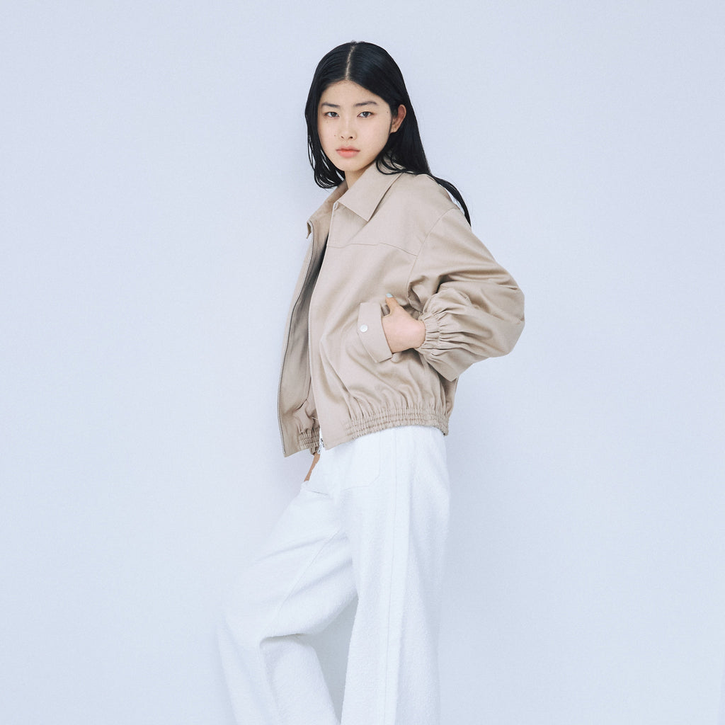 This lightweight blouson for adults is made with different materials, twill cotton and cardboard, for a rich look, and the round sleeves and gathered hem add a feminine touch.