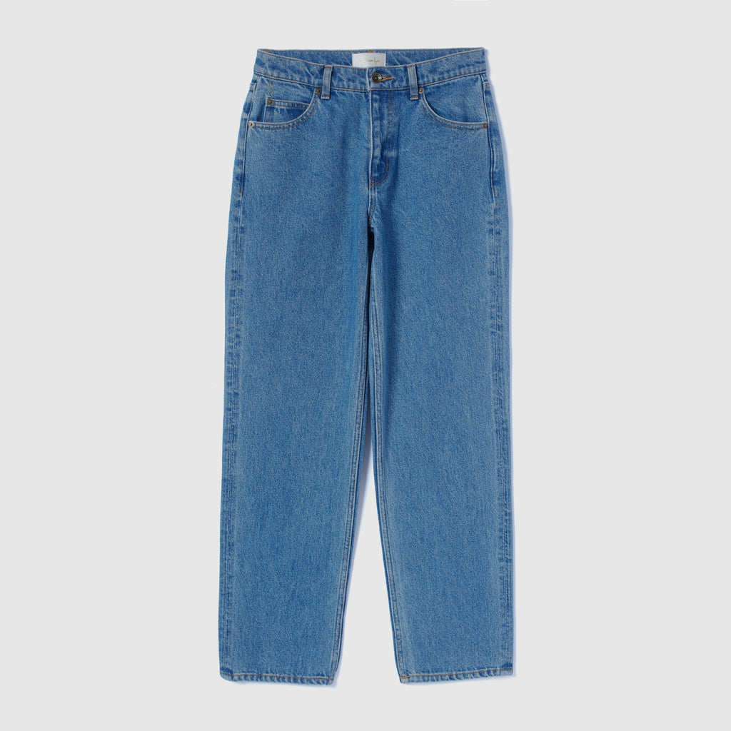 "Baby Blue" is made by bleaching denim to remove as much color as possible. It is a light and shallow color with a slight hint of blue. "Blue" has a worn-in look and a natural distressed finish.