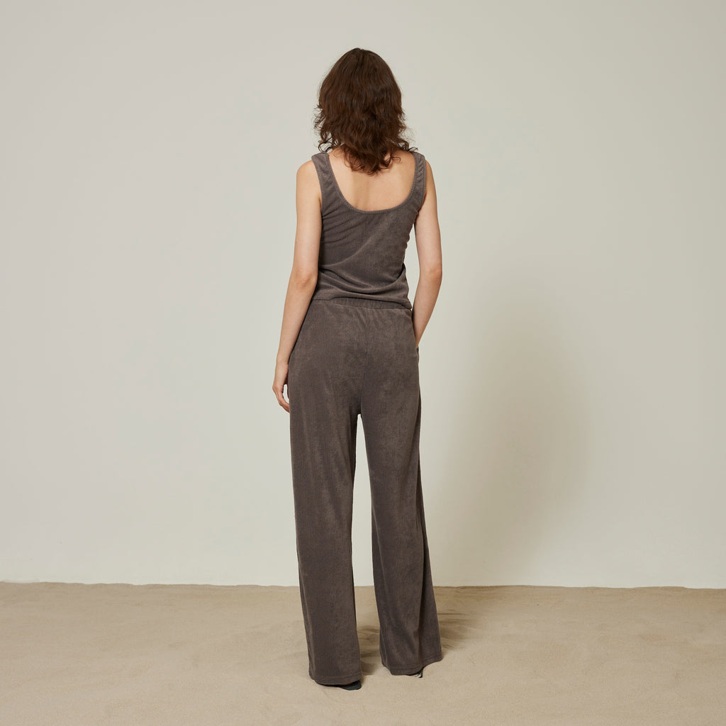 Summery, relaxed pile pants are back again. New colors "Light Blue" and "Mocha" have been added. The wide silhouette makes them easy to wear, making them perfect for travel or the resort. Please try them as a set.