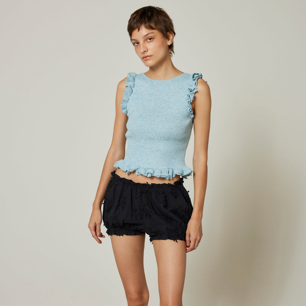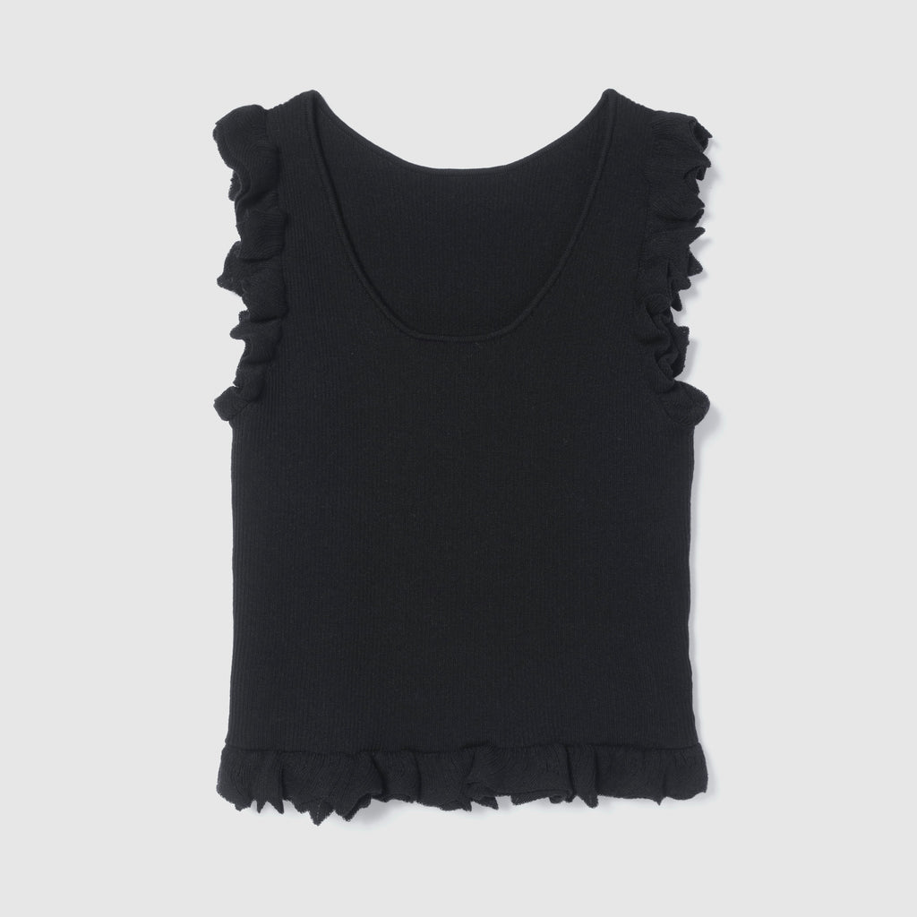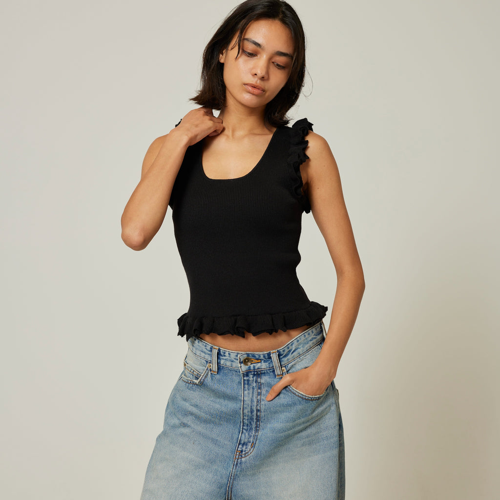 This knit tank has ruffles on the arms and hem. The ruffles are knitted softly into a bag shape and made from two layers, giving it plenty of volume. It's a ruffle top that's just the right amount of casual and not too sweet.