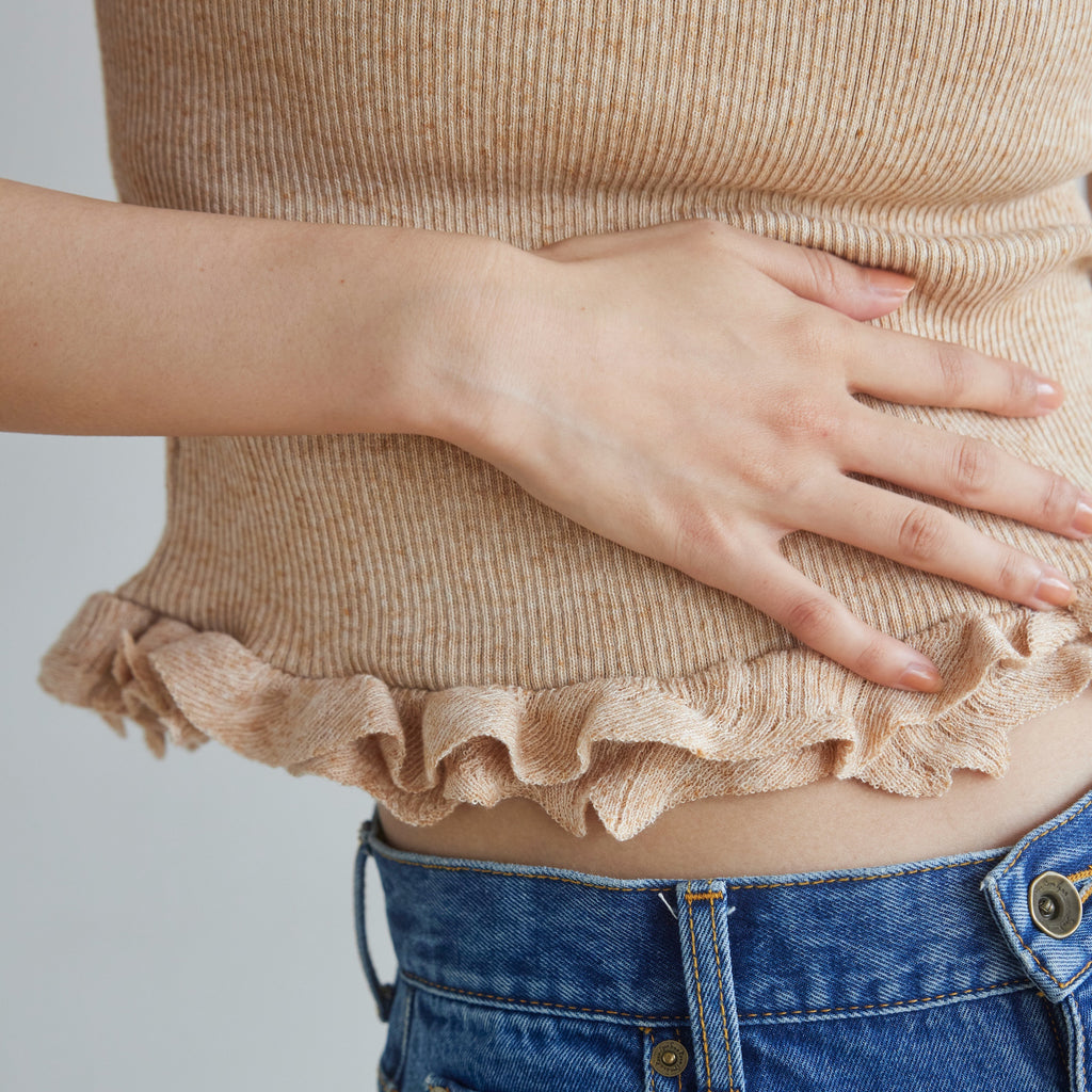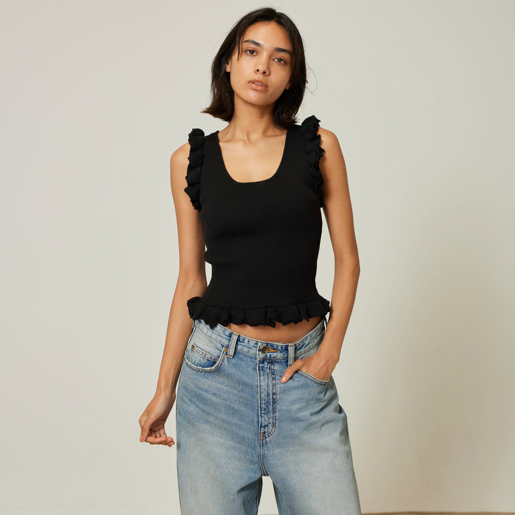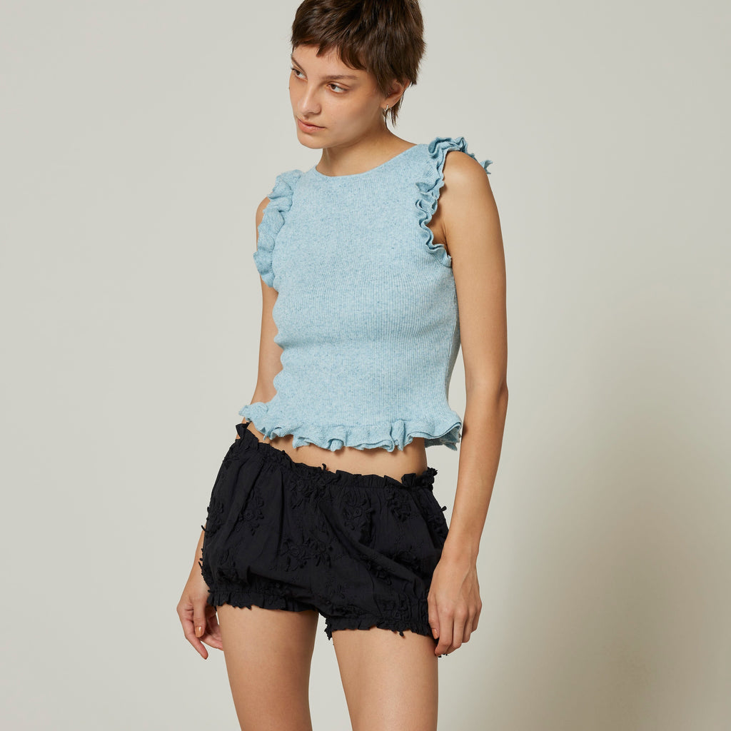 This knit tank has ruffles on the arms and hem. The ruffles are knitted softly into a bag shape and made from two layers, giving it plenty of volume. It's a ruffle top that's just the right amount of casual and not too sweet.