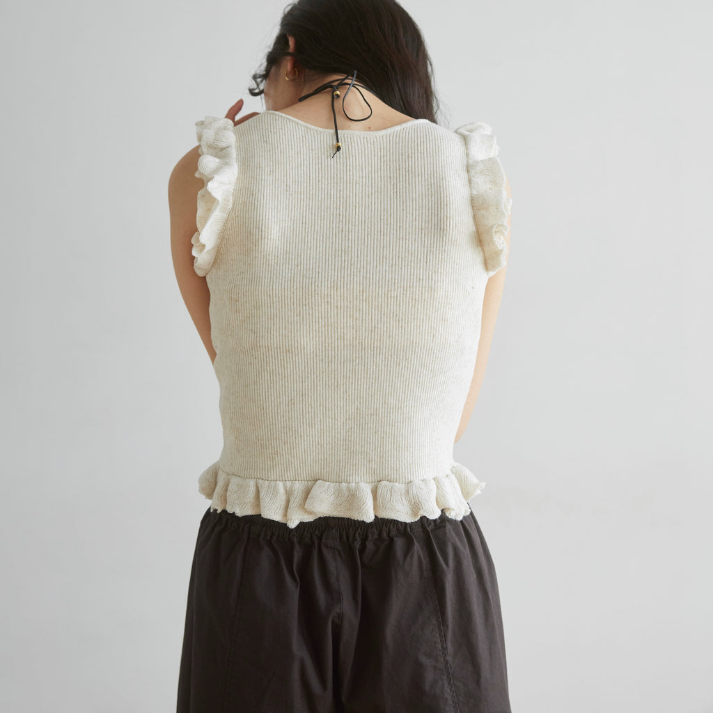 A knit tank top with a comfortable dry texture of cotton and linen. The bold double-layered frills add a touch of glamour, making it suitable for both casual and elegant wear. It can be worn either front or back.