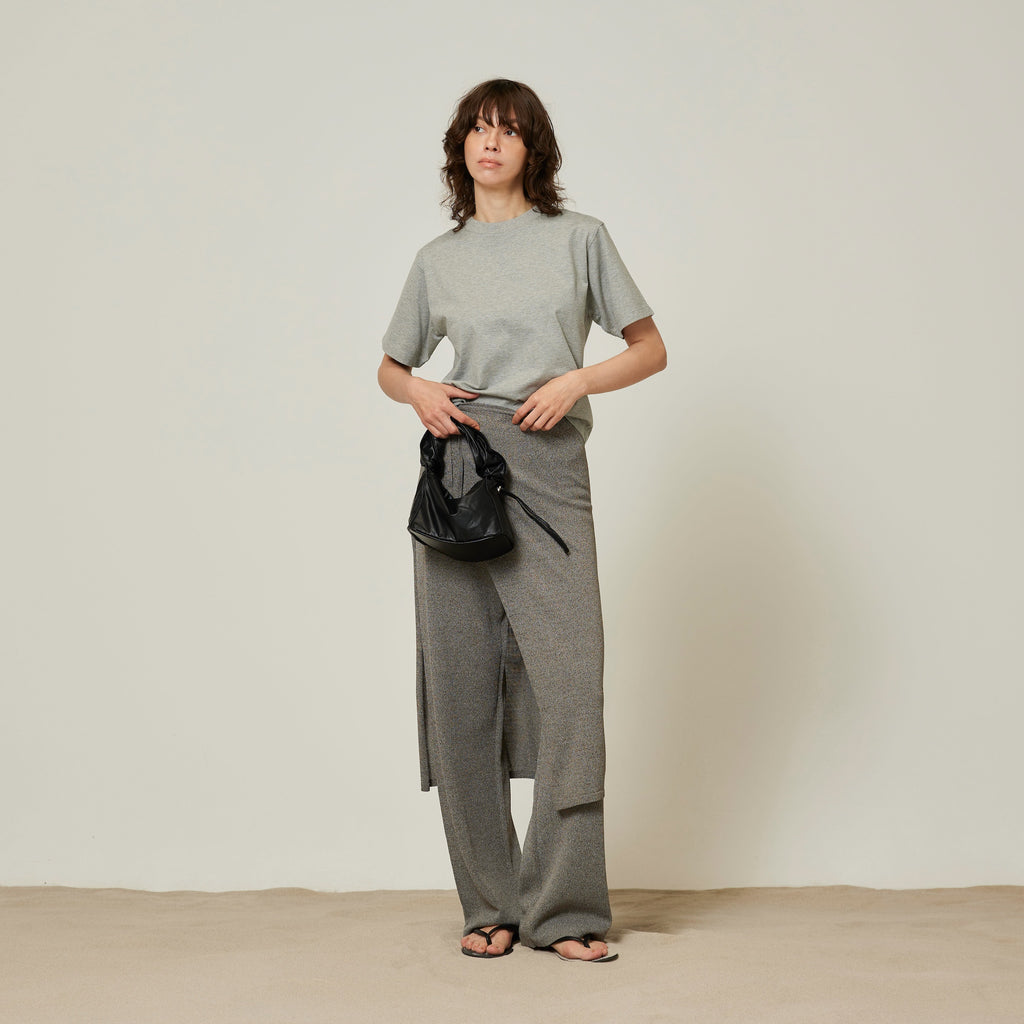The moderate length and the loose silhouette do not show off the body lines too much. It has a calculated balance that gives a relaxed feeling without straining the shoulders, but does not look sloppy. It is attractive for its versatility, as it can be worn alone or layered for a well-balanced look.