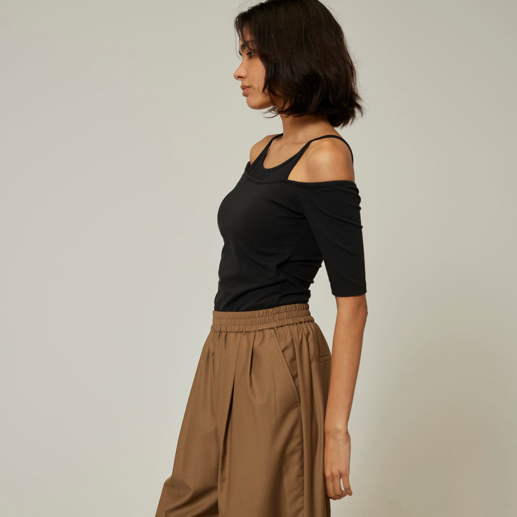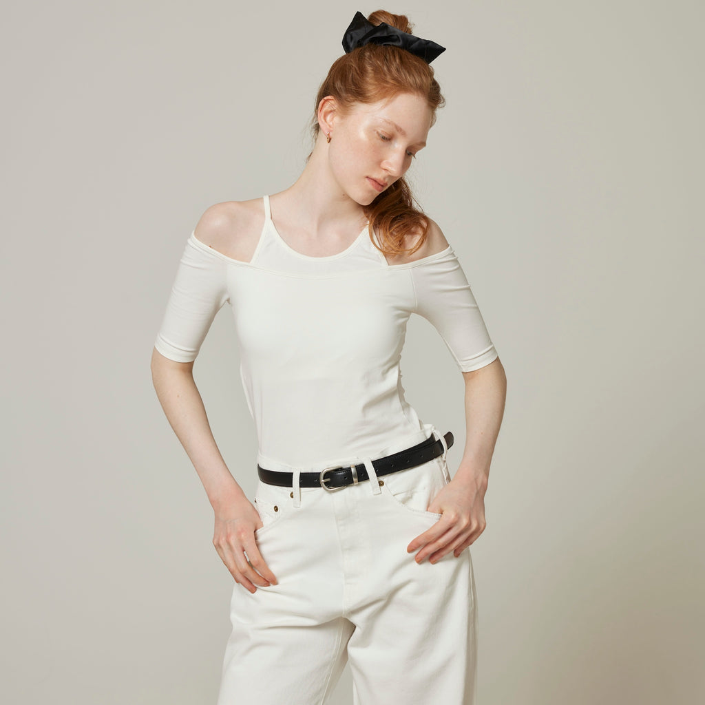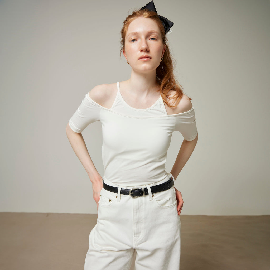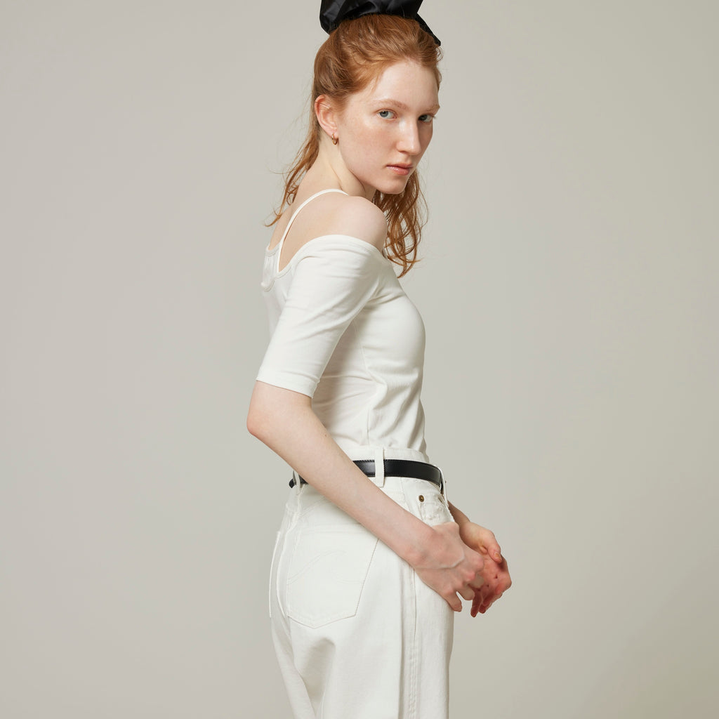 Last year's Smooth Touch Pad in Layered Tops has been updated with half sleeves. The contrast between the delicate American sleeves and the off-shoulder is appealing. It creates a sophisticated silhouette from the décolleté to the shoulders. The 5/4 sleeves are not too loose, so it can be styled in a variety of ways.