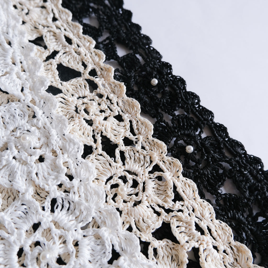 The highlight of this item is the sheer floral crochet pattern. Pearls are hand-stitched on top, and just wrapping it around your neck will make it the focal point of your outfit. The design is minimalist, taking advantage of the unique knitting.
