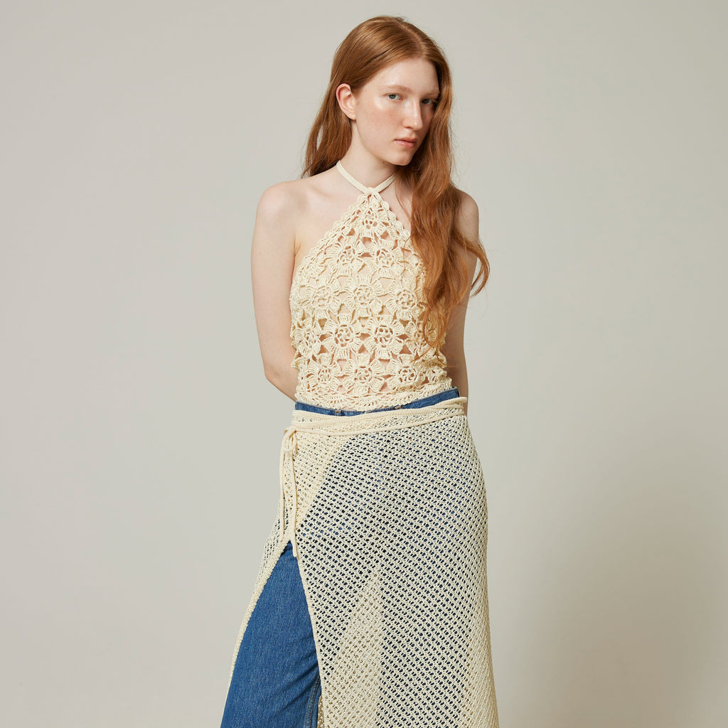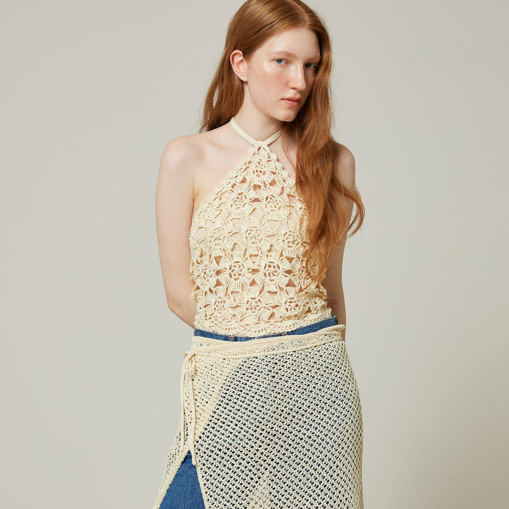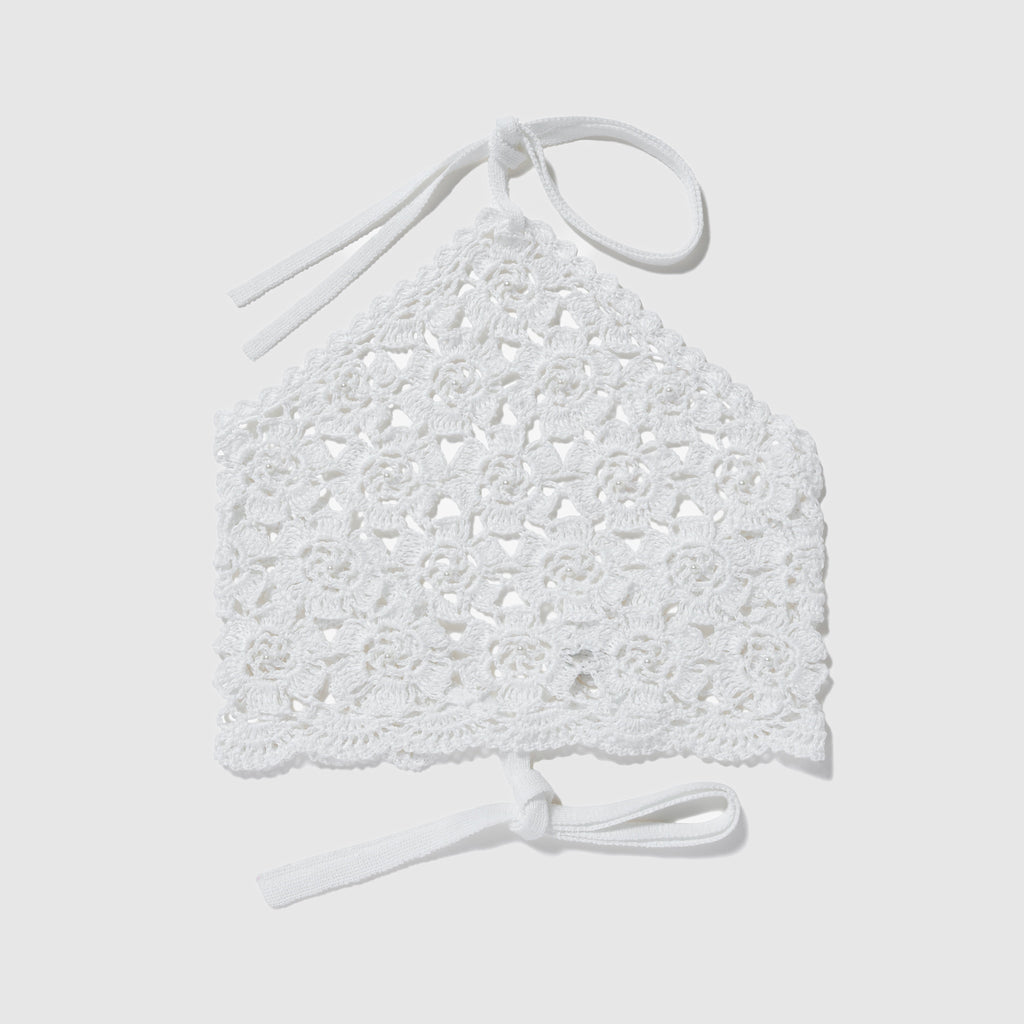 A bandana-shaped triangular knit bustier that can be layered over a T-shirt or camisole. The floral motif crochet is perfect for summer, and it is a multi-purpose item that can be paired with babouches or a skirt.