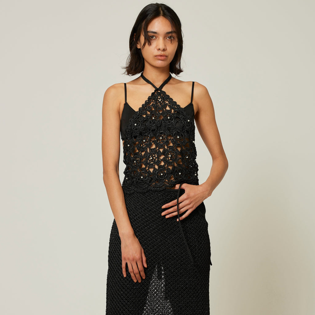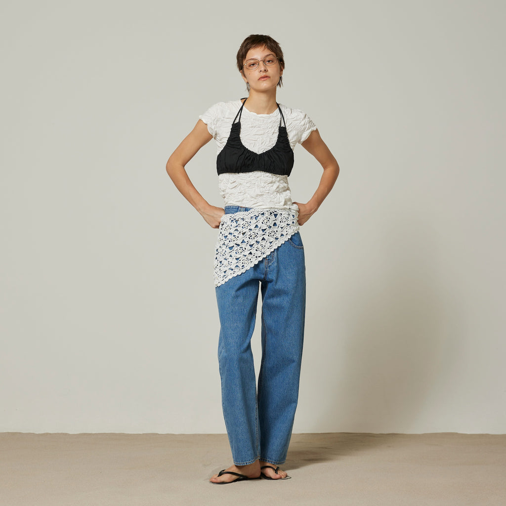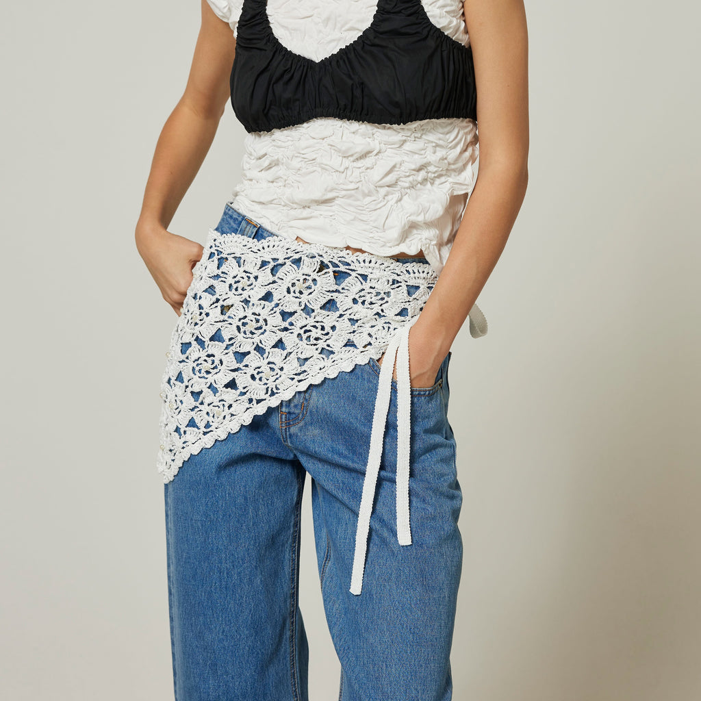 A bandana-shaped triangular knit bustier that can be layered over a T-shirt or camisole. The floral motif crochet is perfect for summer, and it is a multi-purpose item that can be paired with babouches or a skirt.