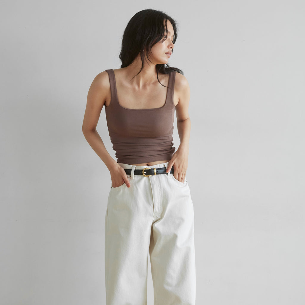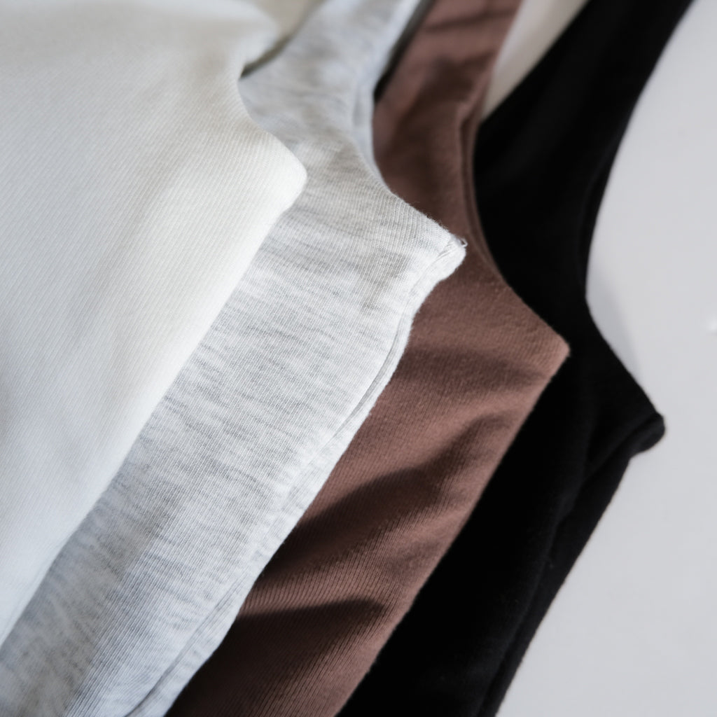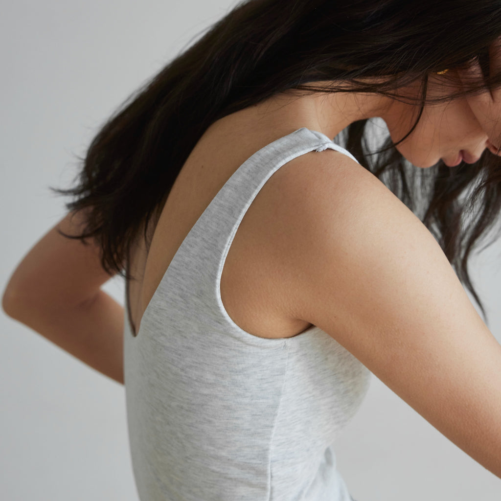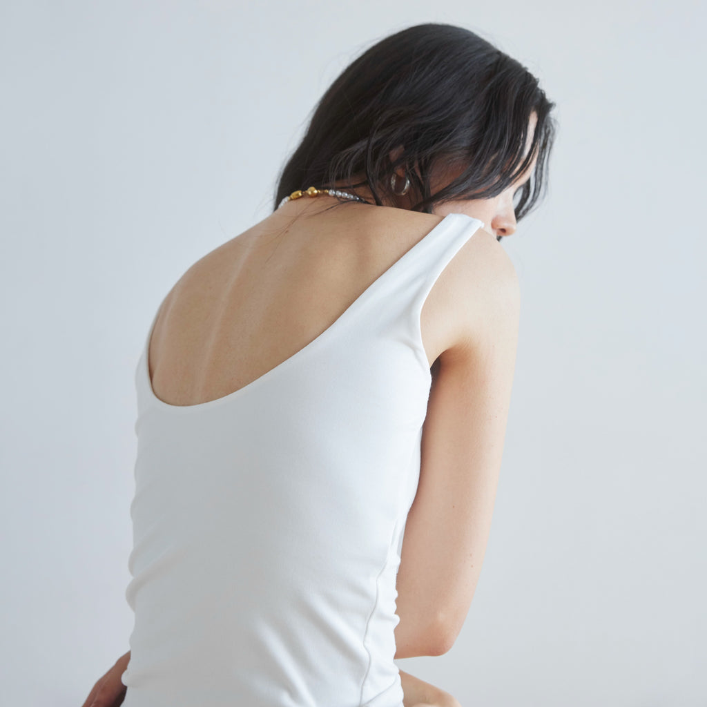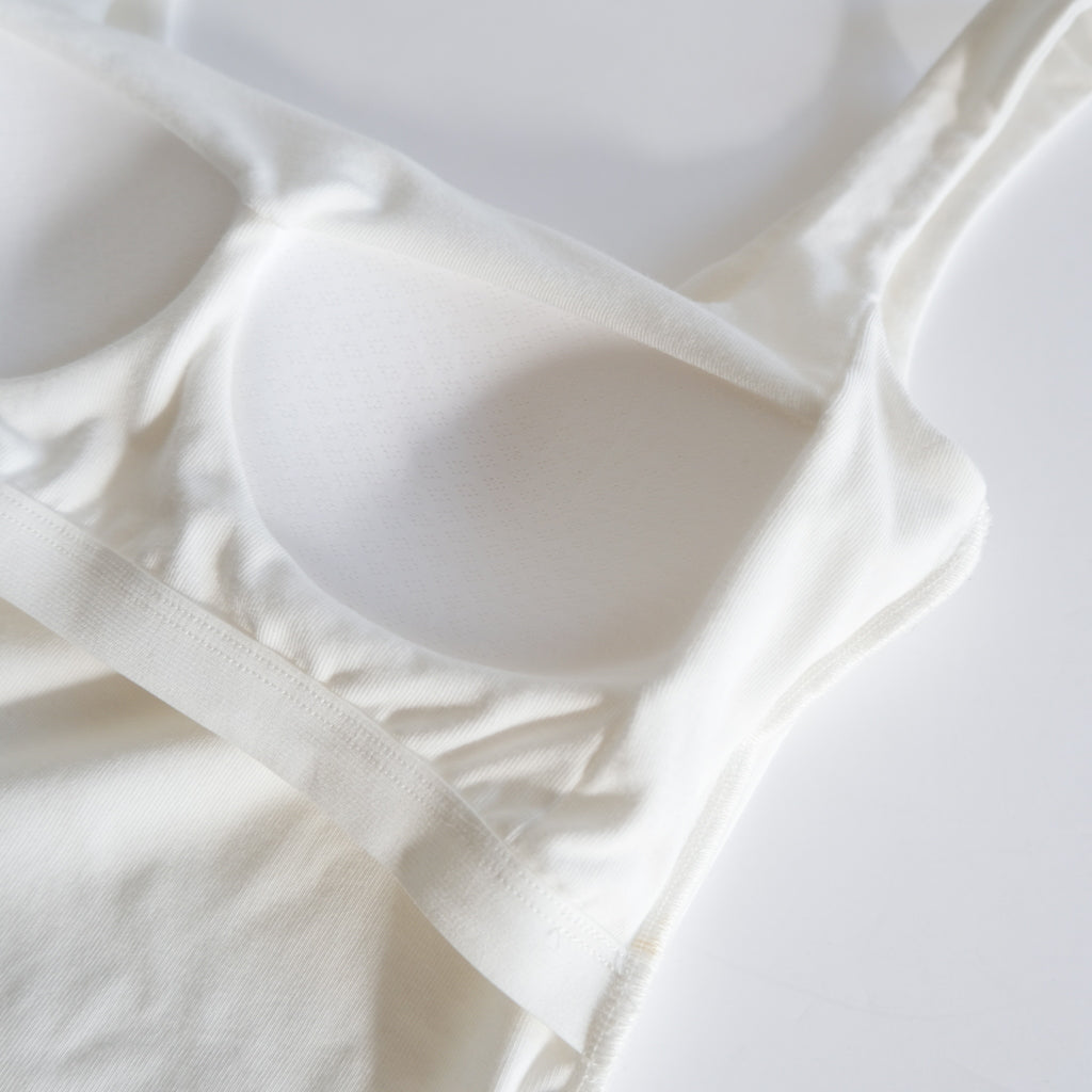 A tight silhouette that fits the body. It has the same length and bust size as the Fit Pad Marshmallow Basic Tank, but this time it is seamless for a more relaxed and soft feel. It is also sized to be easily worn as an inner layer.