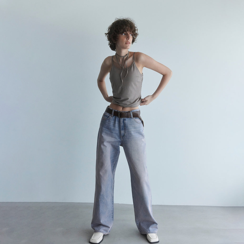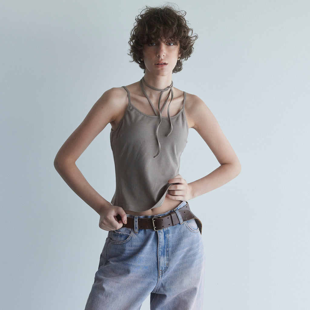 You can wear it by itself, or wear it as an inner layer with a designer T-shirt such as the Cotton Shirred Mini Top. It also goes well with a cardigan such as the Light Sheer Random RIB Short Cardigan.