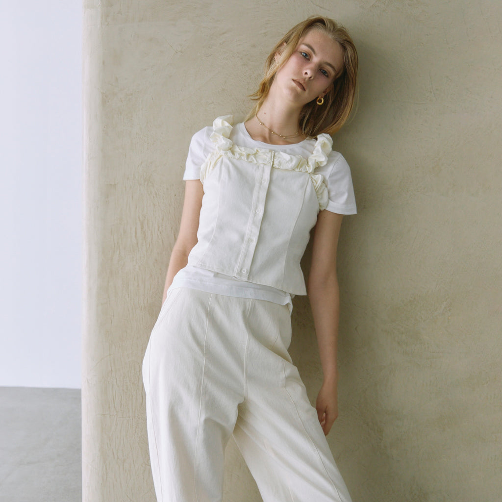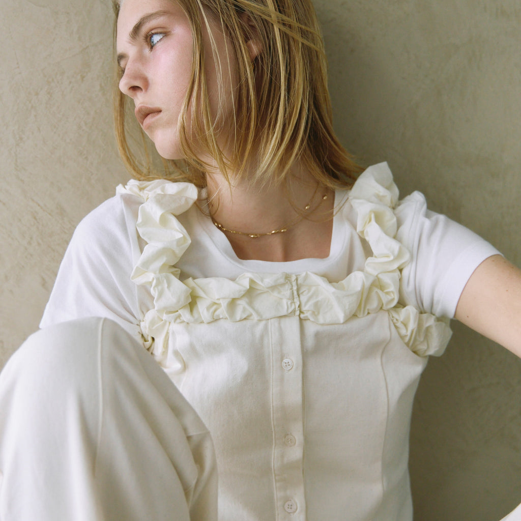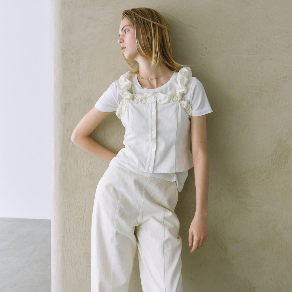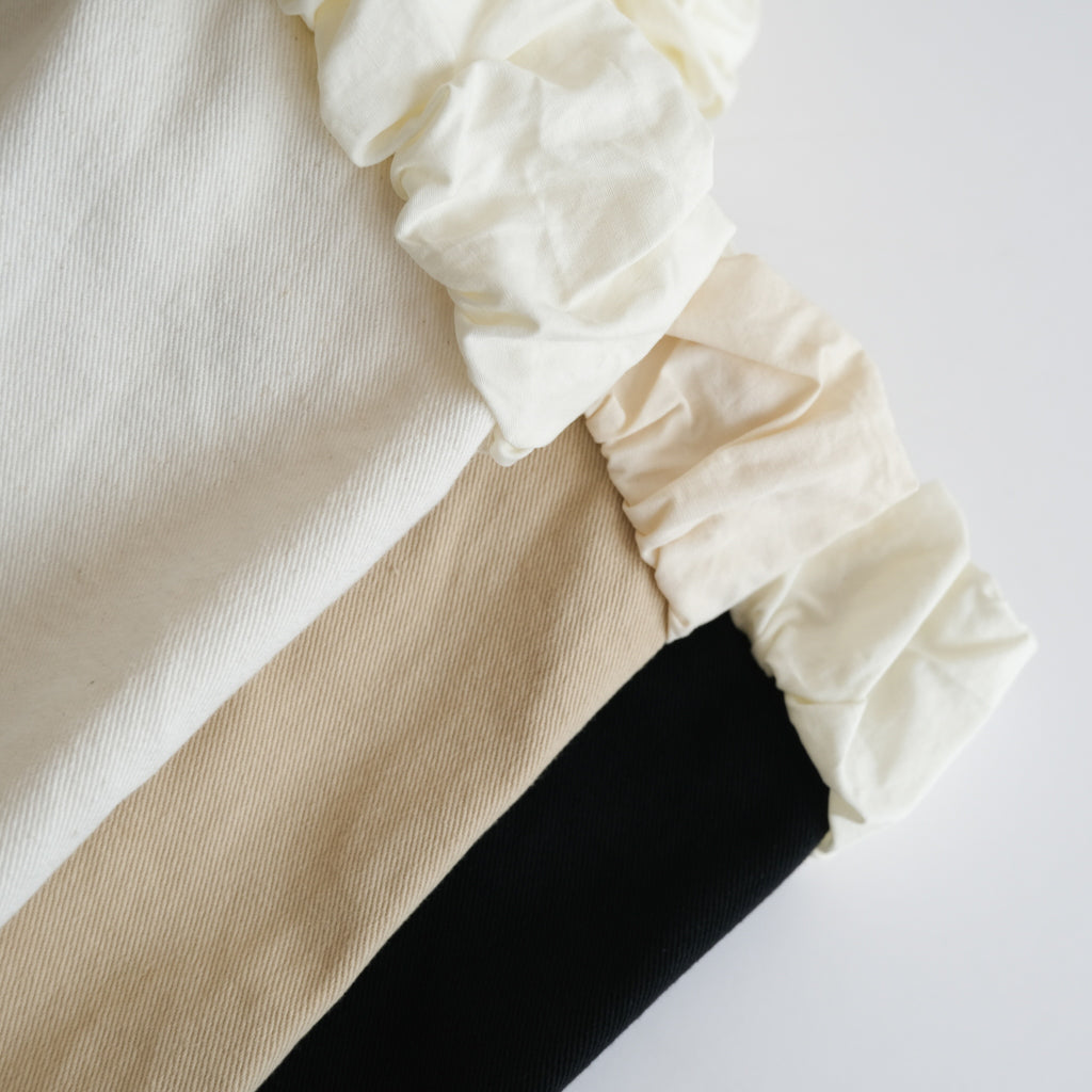 The "off-white" has a slightly textured fabric, giving it a natural and casual look even in white. The "black" and "nut" colors have a contrasting color design. The frills are made of lightweight shirt fabric.