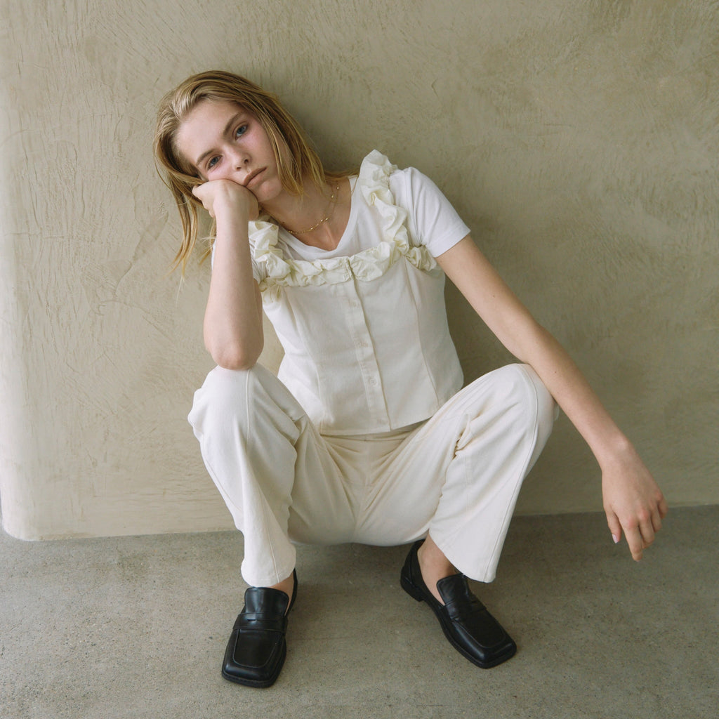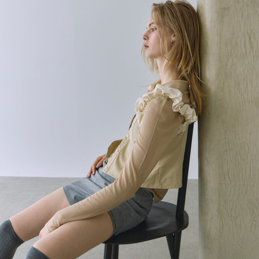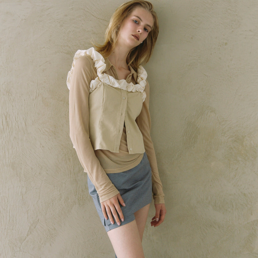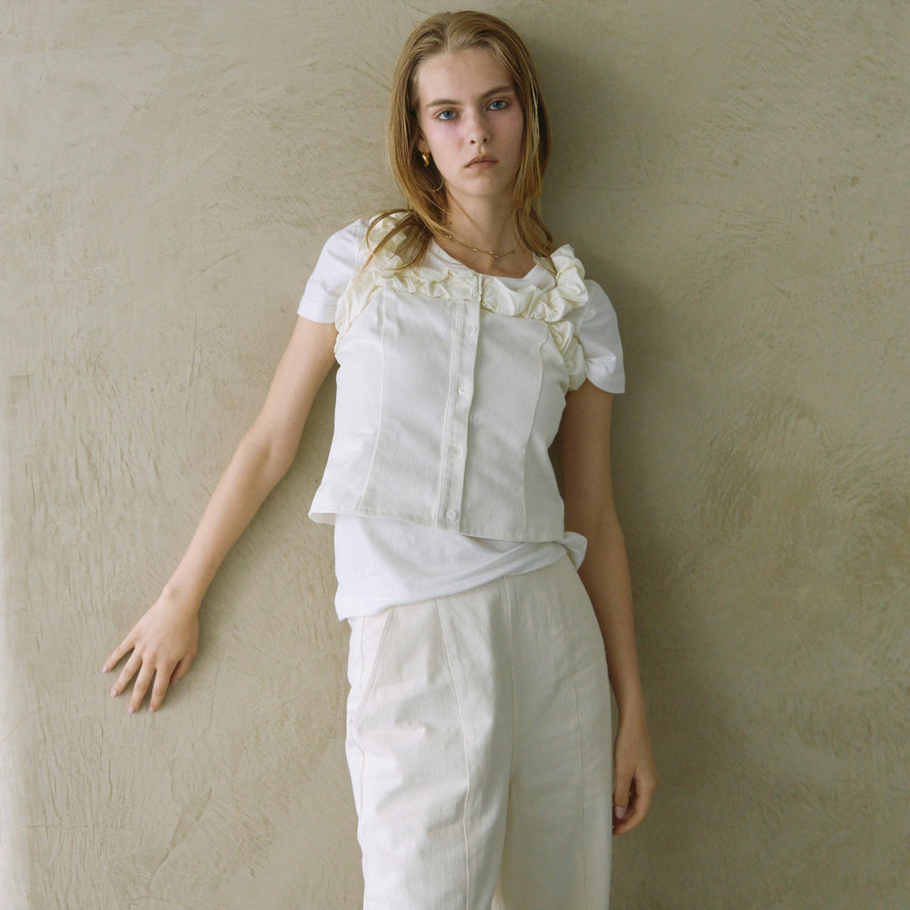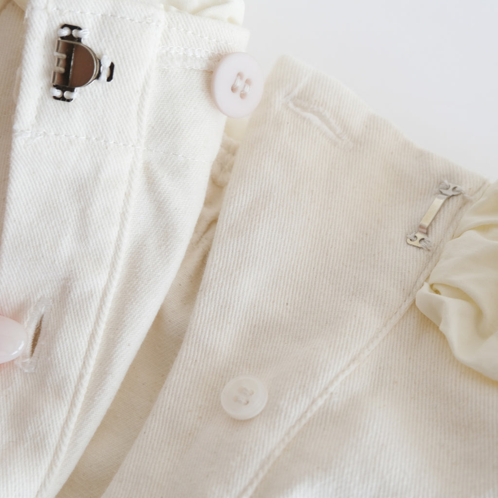 The "off-white" has a slightly textured fabric, giving it a natural and casual look even in white. The "black" and "nut" colors have a contrasting color design. The frills are made of lightweight shirt fabric.