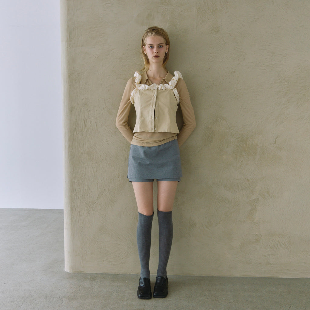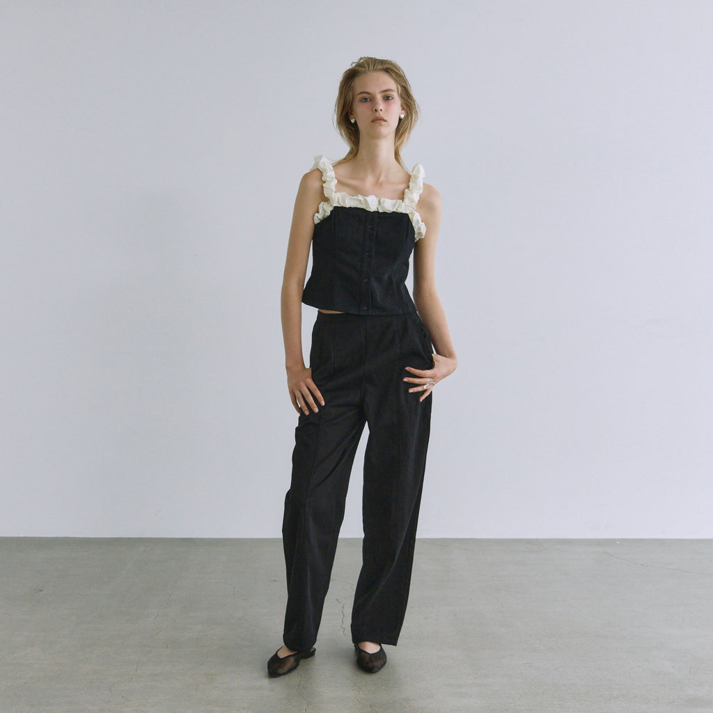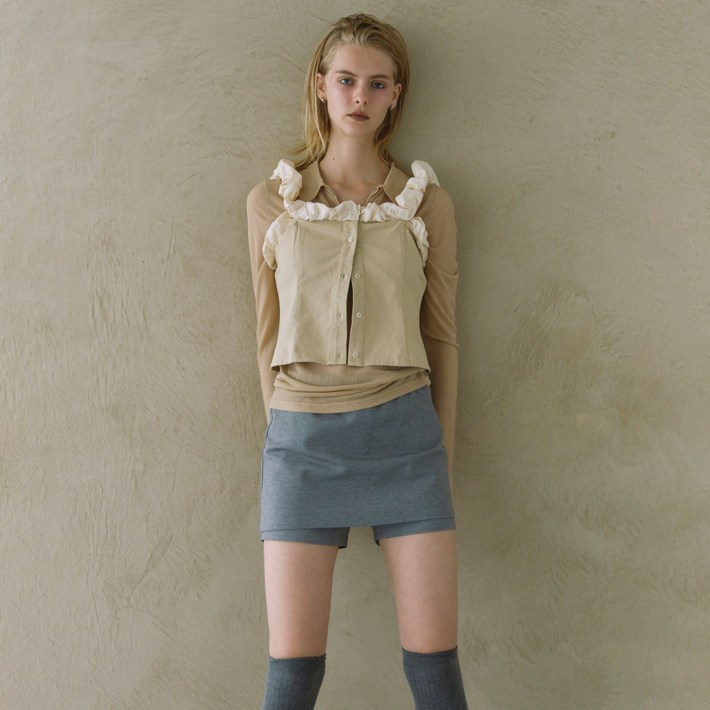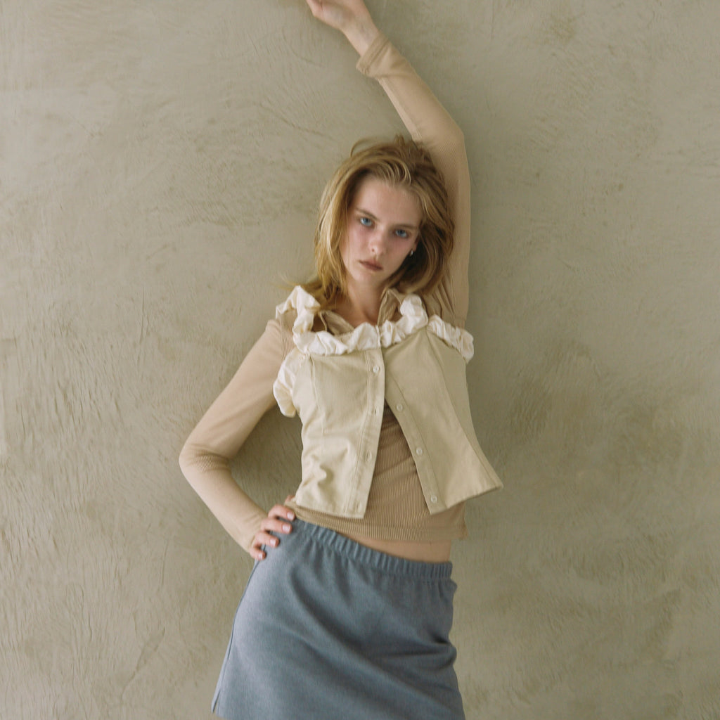 The "off-white" has a slightly textured fabric, giving it a natural and casual look even in white. The "black" and "nut" colors have a contrasting color design. The frills are made of lightweight shirt fabric.