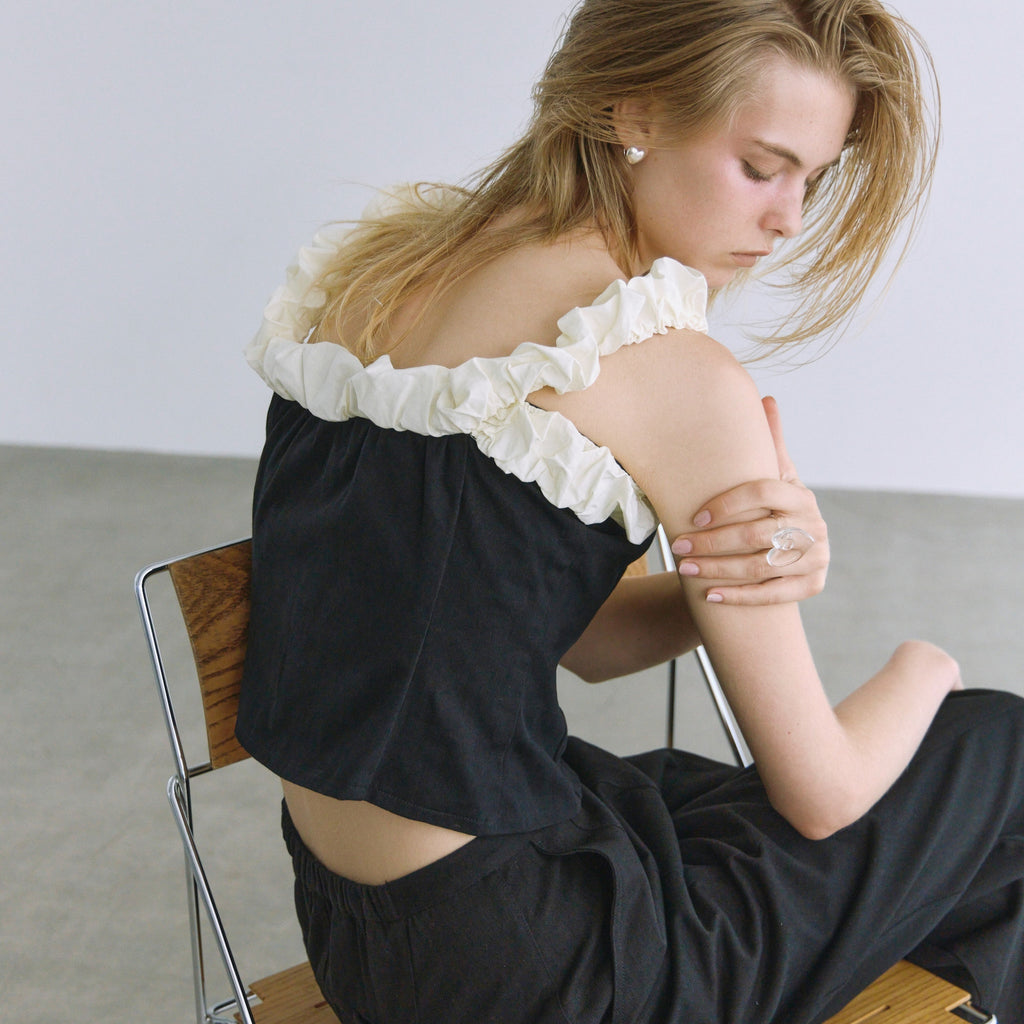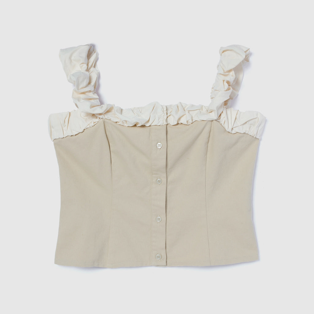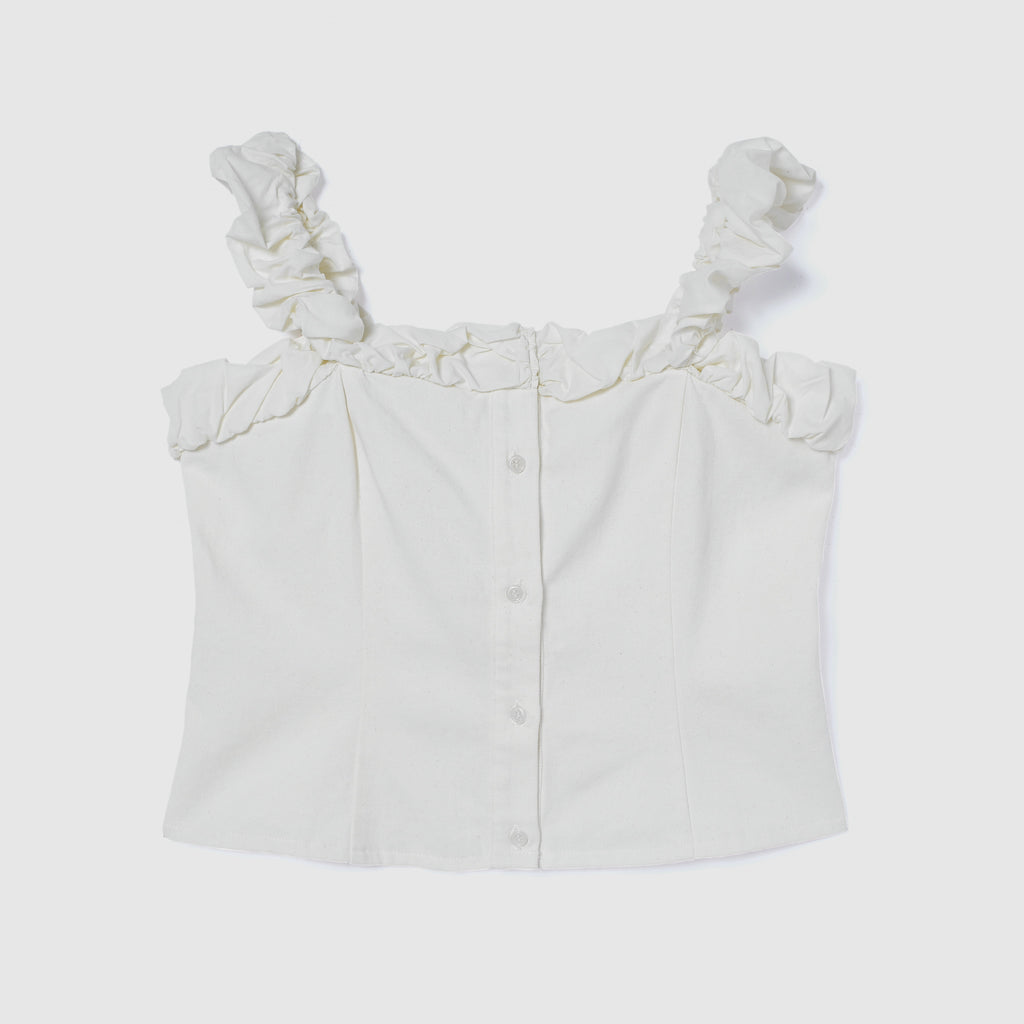 This bustier top features a natural cotton fabric with gorgeous ruffle details. It can also be worn off the shoulder, making it a 2-way piece. Layering it makes it a versatile piece that can be worn all year round.