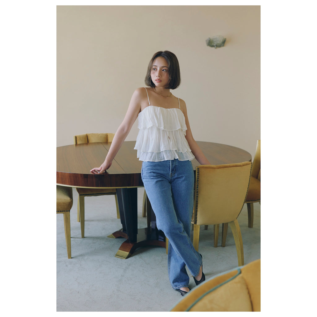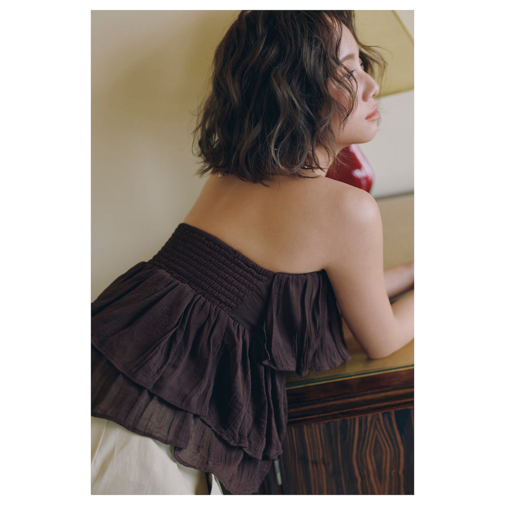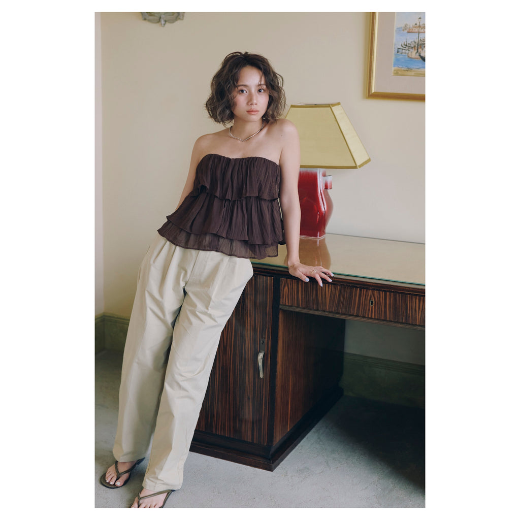 The three voluminous ruffles are the main feature of the design. The amount and gathering of each tier is adjusted, and the second and third tiers are unlined, giving the dress a special silhouette that is airy yet sleek.