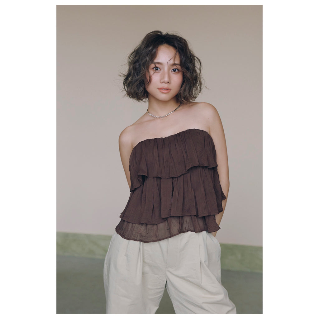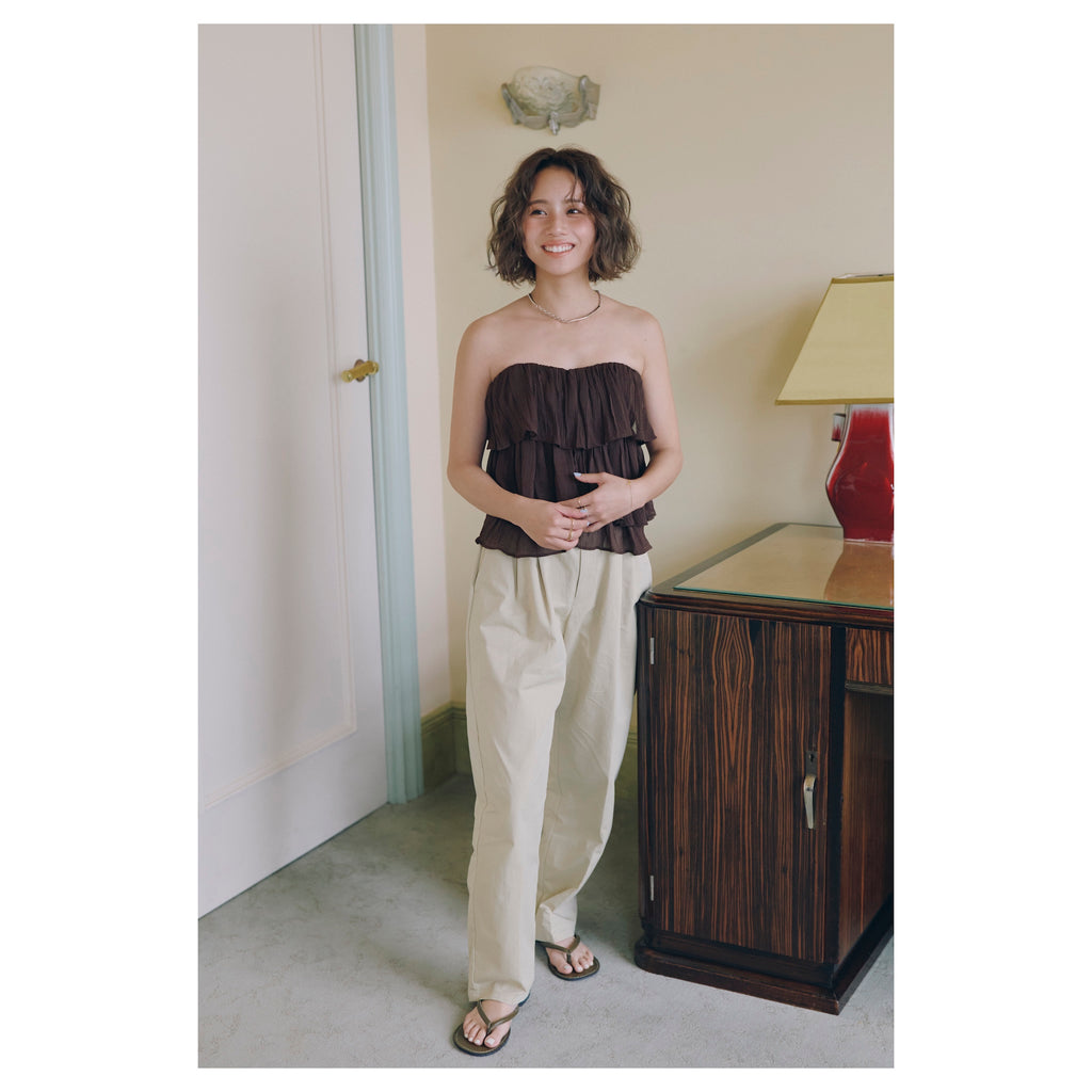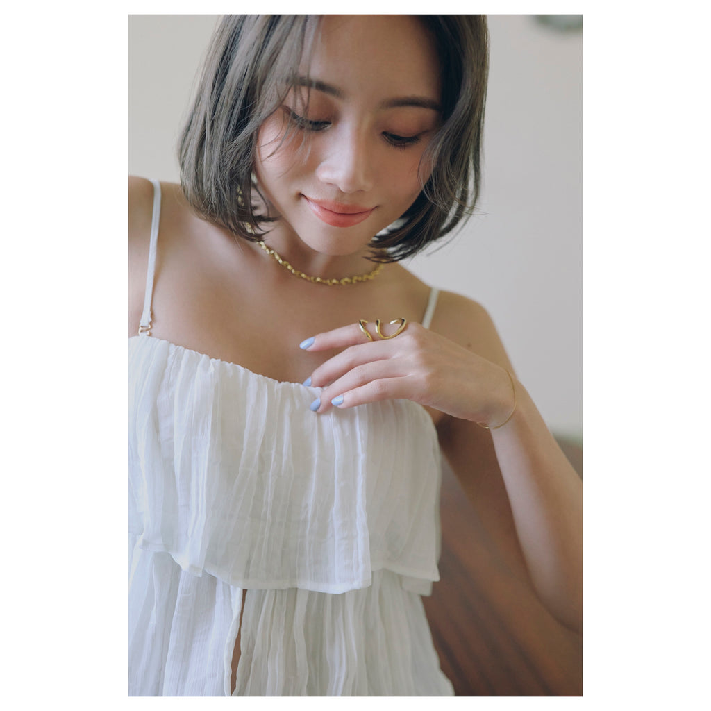 The fabric is made of willow chiffon, which has just the right amount of transparency and a finely textured surface. In addition, the fabric has been given random vertical wrinkles to create a three-dimensional look. It flutters softly with every movement, adding a summery lightness and airiness.