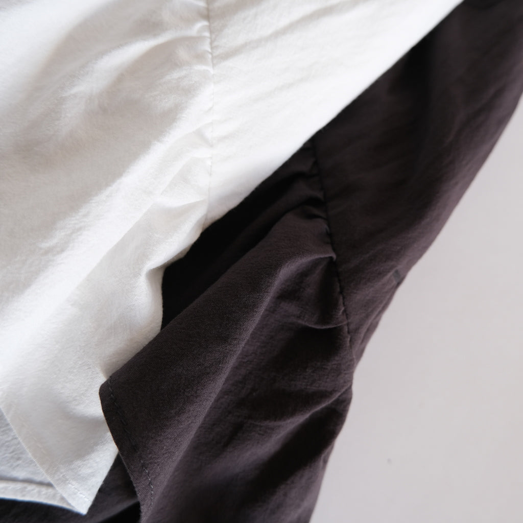 The design is striking, with bold panel changes and a V-line motif, and asymmetrical tiered frills. The length of the frills varies for each tier, creating a natural movement and a light swaying effect. It has a modern atmosphere with a subdued sweetness, while also enhancing femininity.