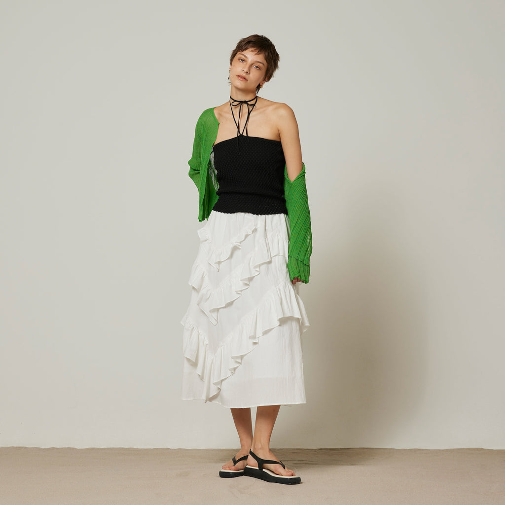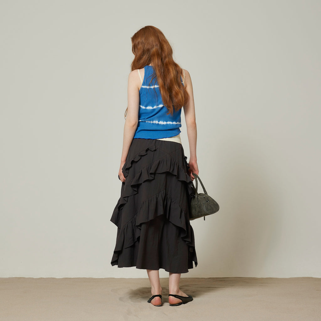 ◆ Coordination We recommend pairing it with an American style tank top to make it more casual. Pairing it with a cropped top will highlight the ruffles at the waist and give you a slimming effect.