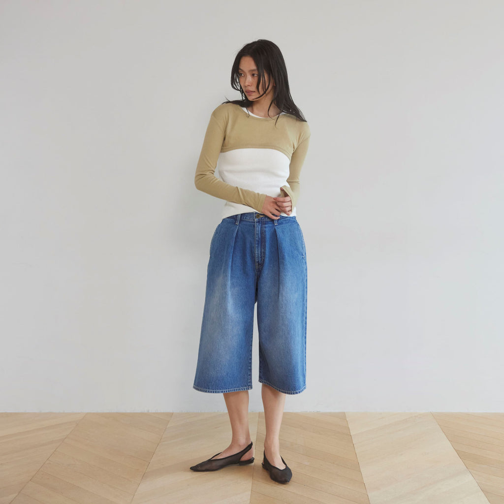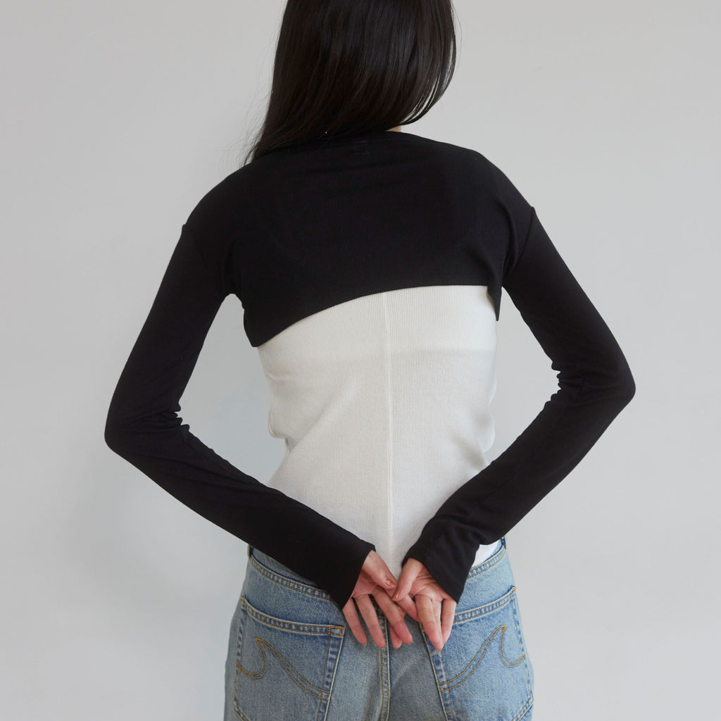 A unique design that resembles a cut-out long-sleeved T-shirt. The length is carefully chosen to avoid emphasizing the bust too much, and the cut creates an arch.