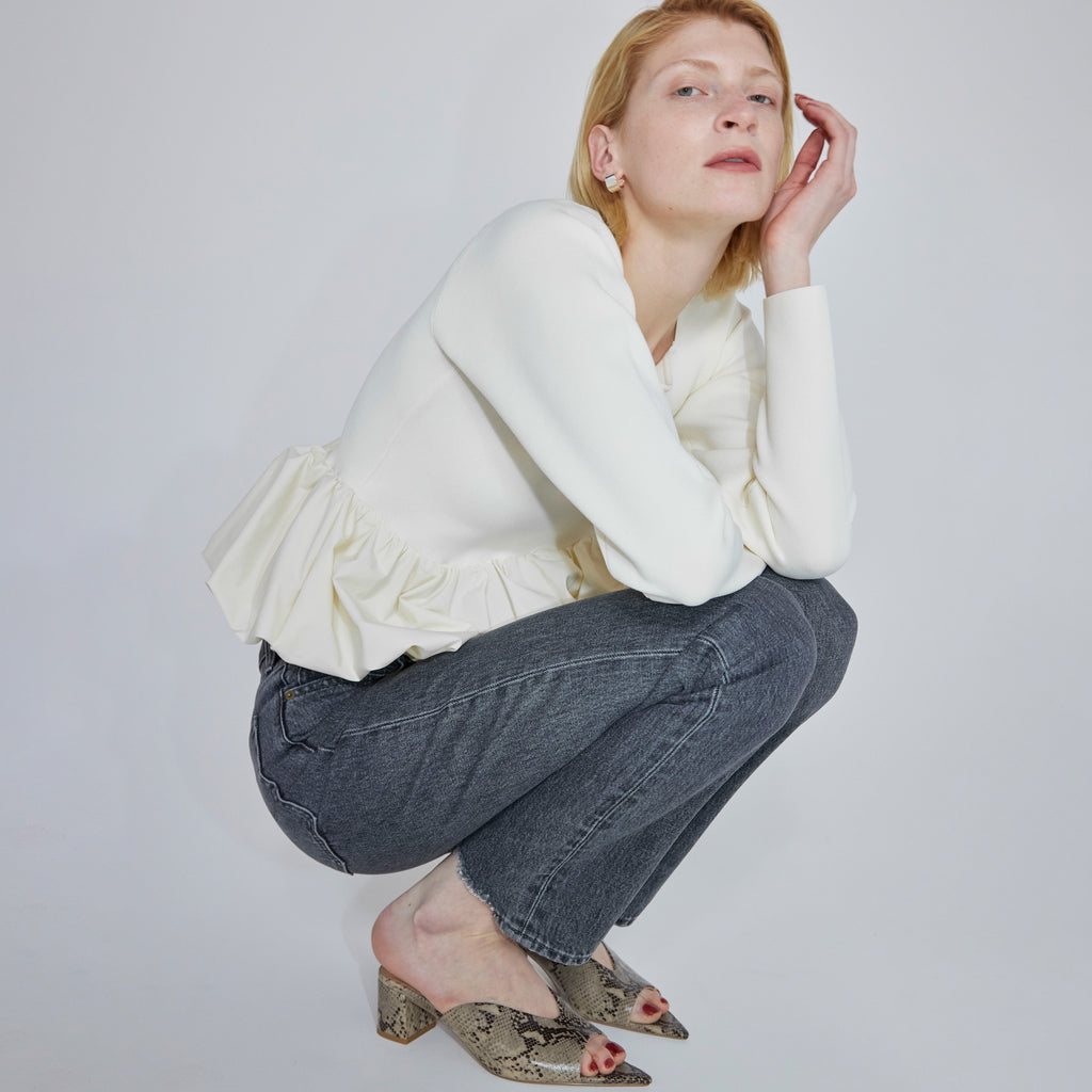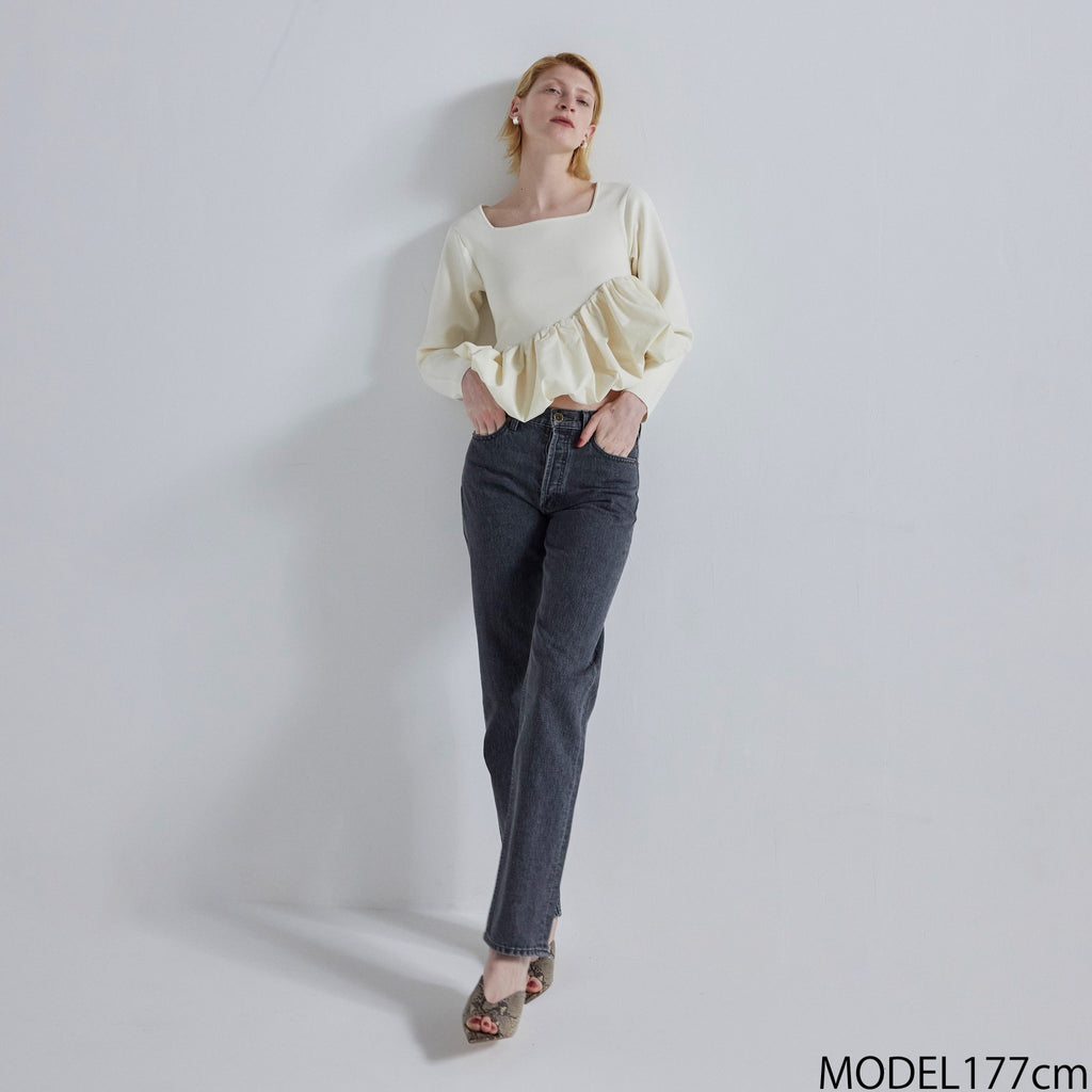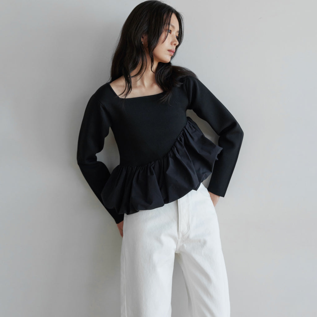 A balloon top made of a combination of knit and woven fabrics. It has a ladylike feel, but is also playful with its asymmetrical design.
