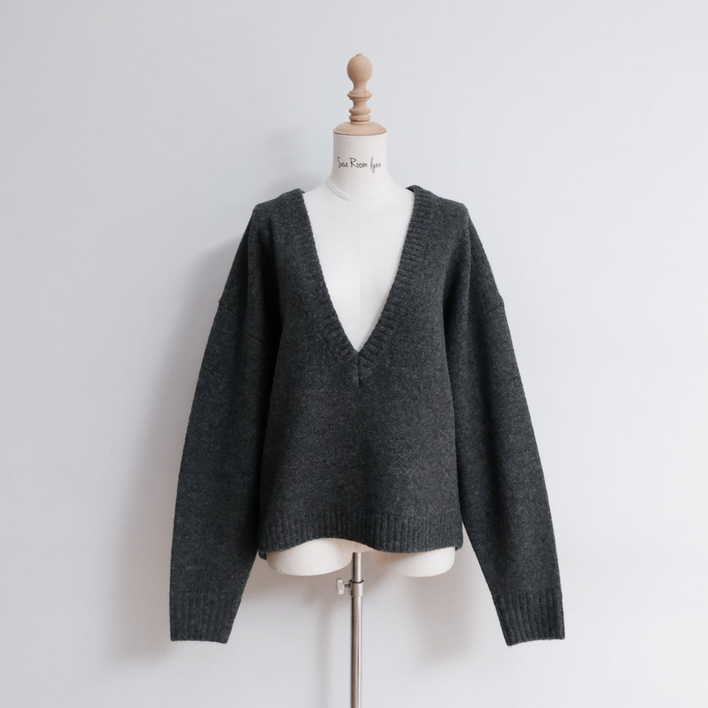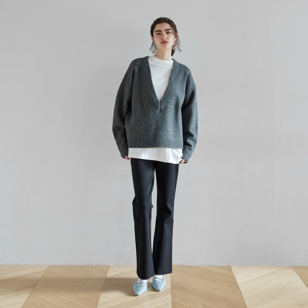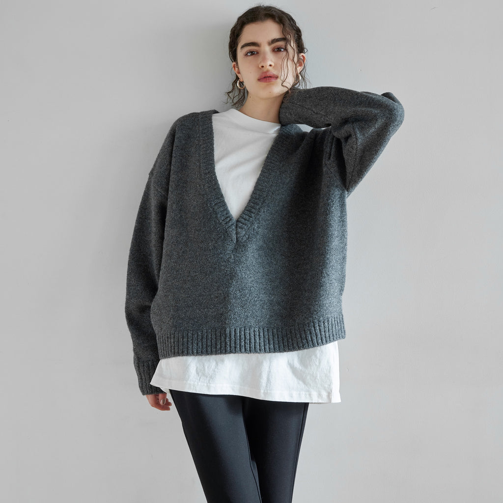 The V-neck is deeper than the bust, so you can enjoy layering and it also reduces the weight of the knit. The rest of the piece is basic, so the ribbing on the neck, cuffs, and hem adds a stylish touch.