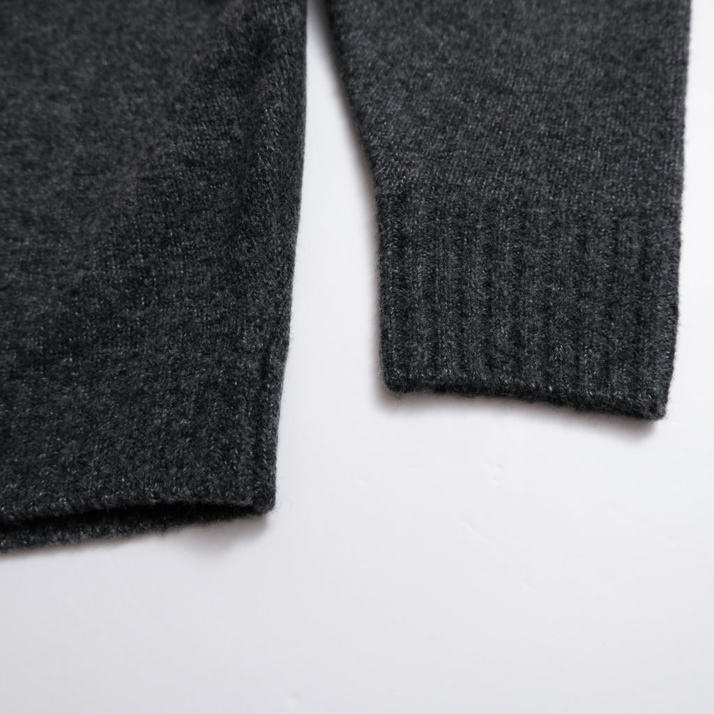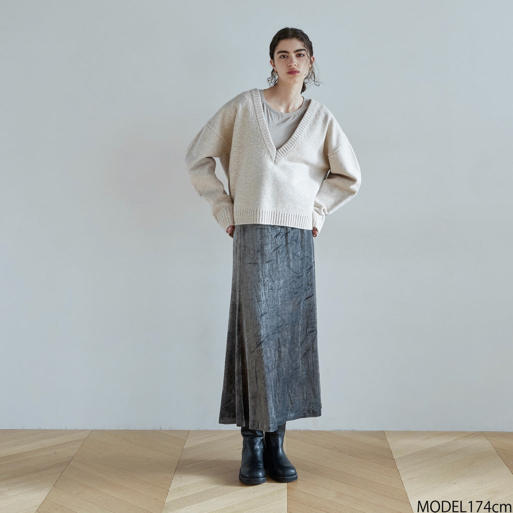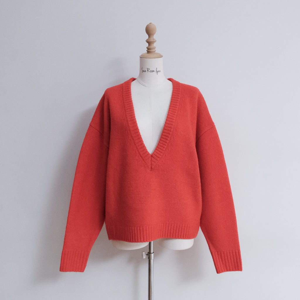 The V-neck is deeper than the bust, so you can enjoy layering and it also reduces the weight of the knit. The rest of the piece is basic, so the ribbing on the neck, cuffs, and hem adds a stylish touch.