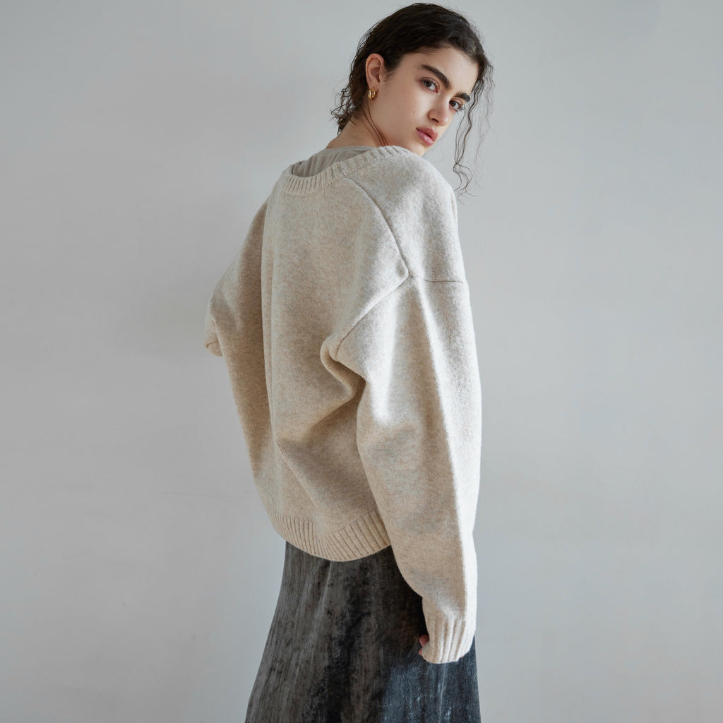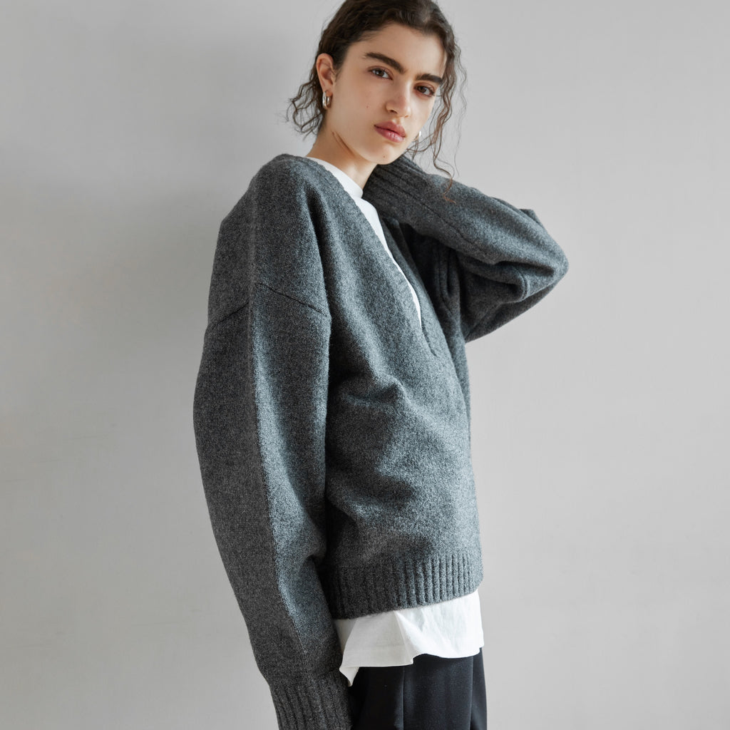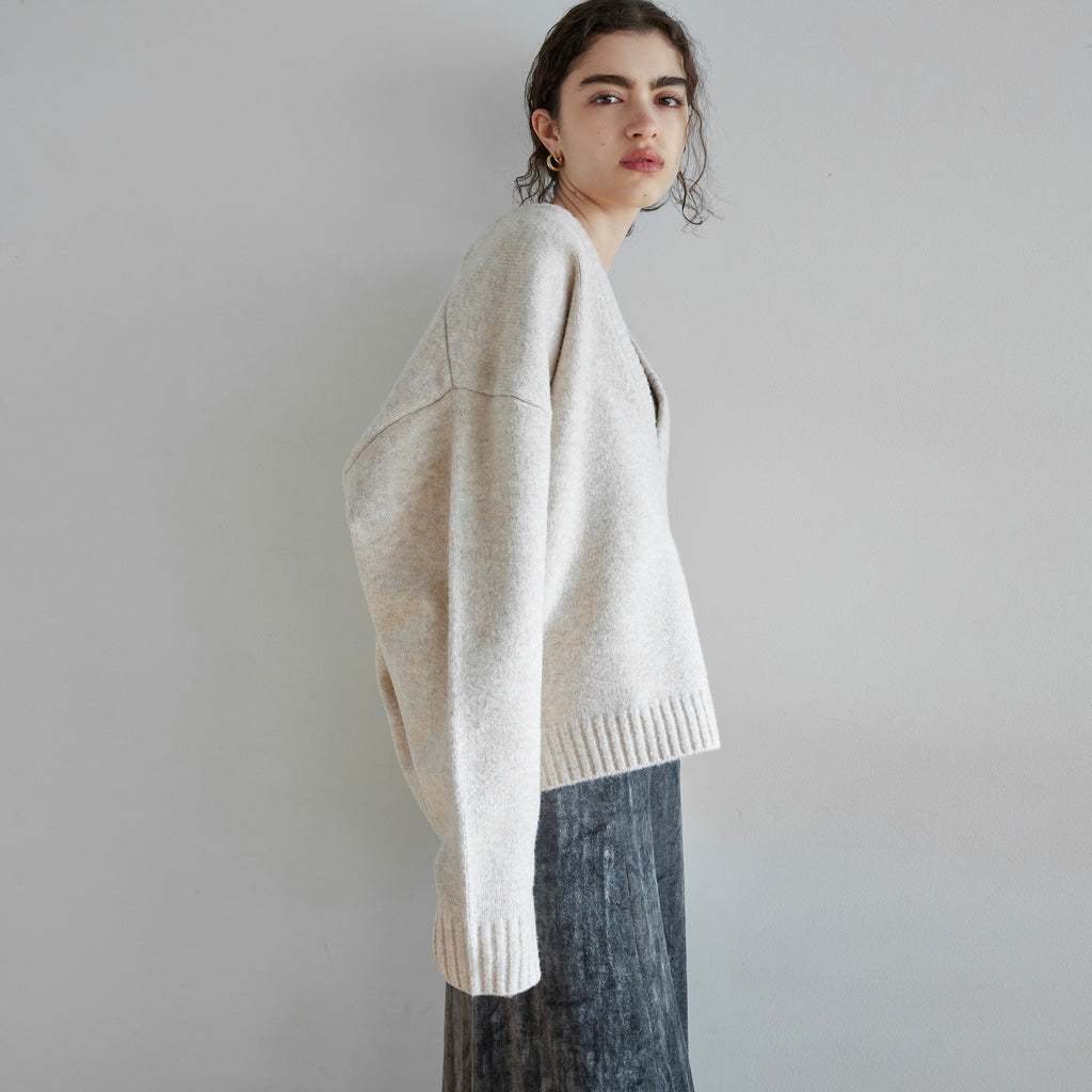 A new item from the popular warm <Wool Mix> series has been released every year. This is a basic top with a bold V-neck and plenty of looseness. This piece is cute with its delicate colors made from various threads.