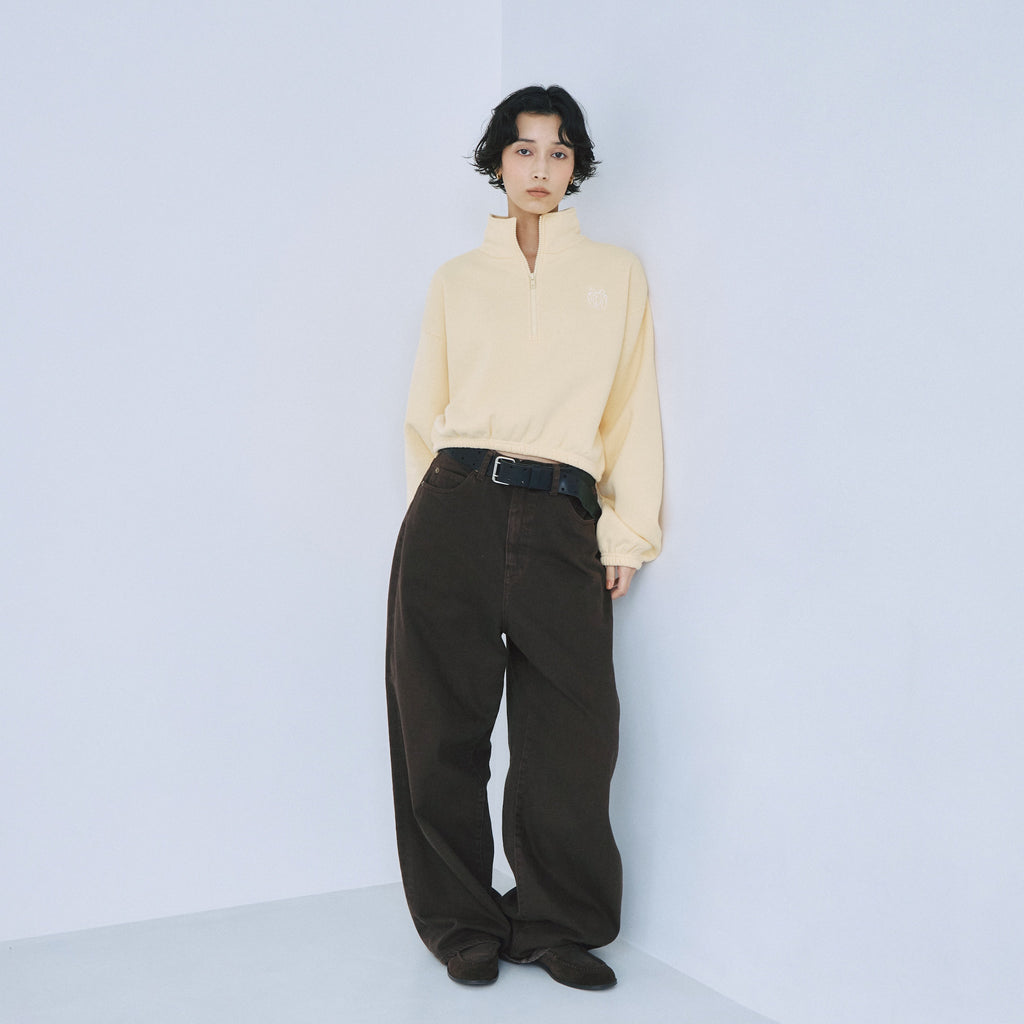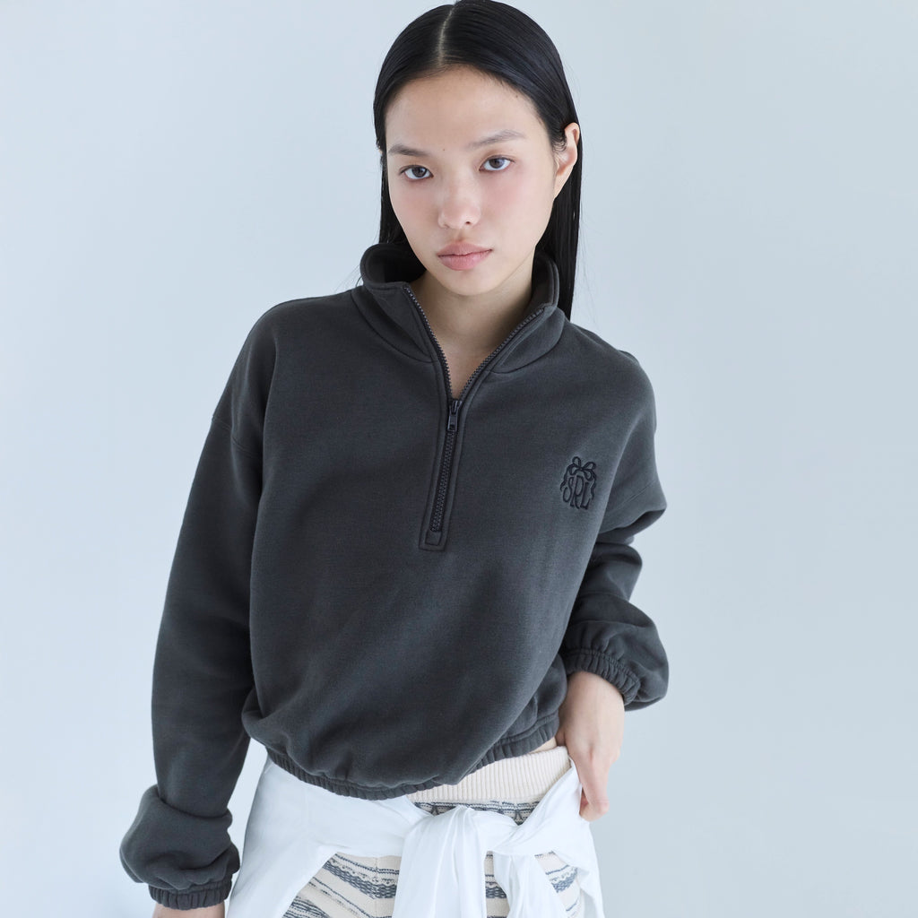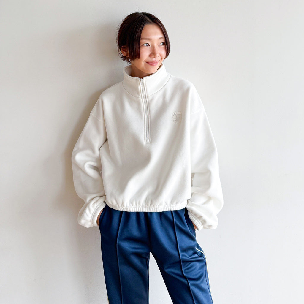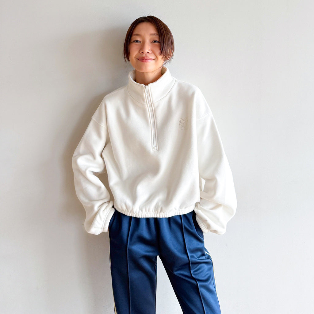 もちもちとした肉厚のオリジナル裏起毛は保温性に優れ、軽さと肌触りも抜群。リボンロゴが効いたハーフジップで、暖かさと上品なカジュアル感を両立します。