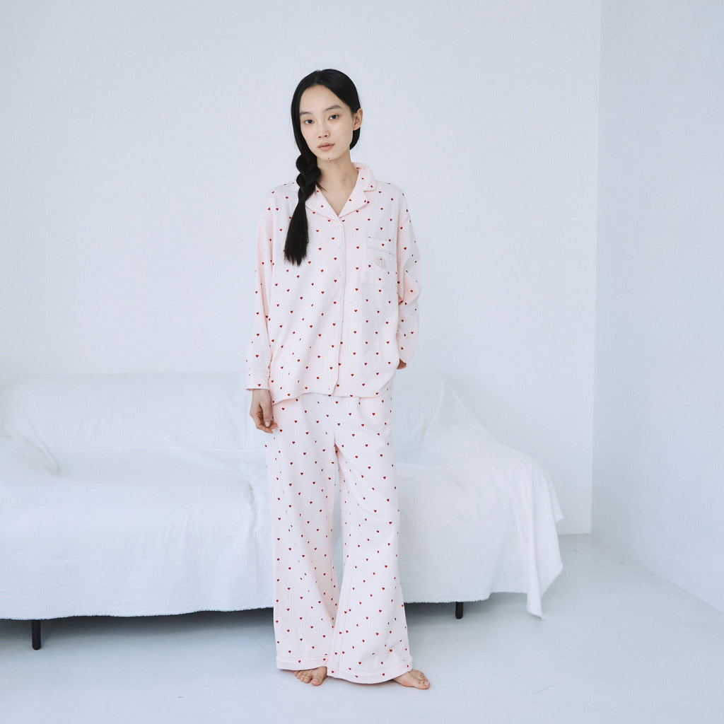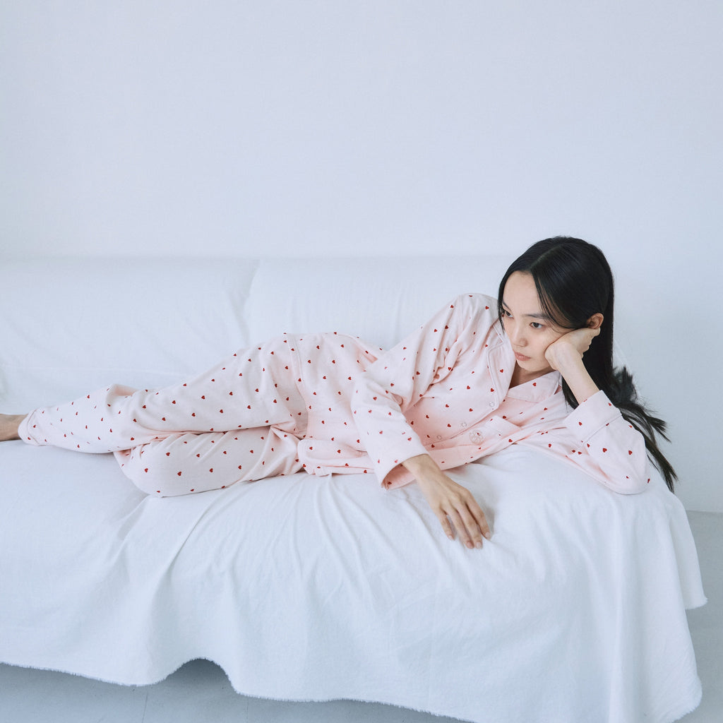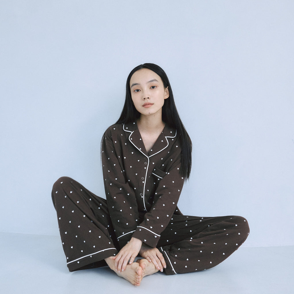 Introducing the long-awaited long-sleeved loungewear from the HOME series. This set features a relaxed silhouette, but the details add a touch of elegance without being too casual. The top is available in one size, and the pants come in two sizes: S and M.