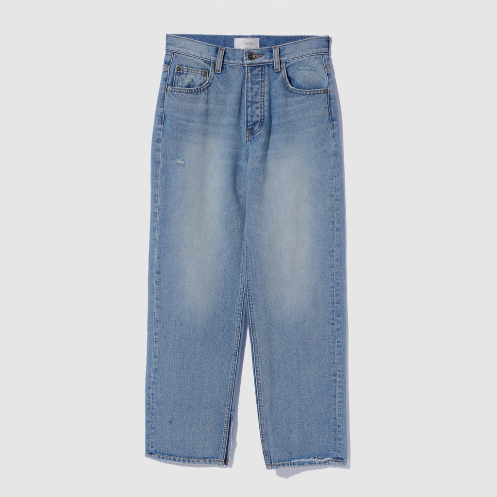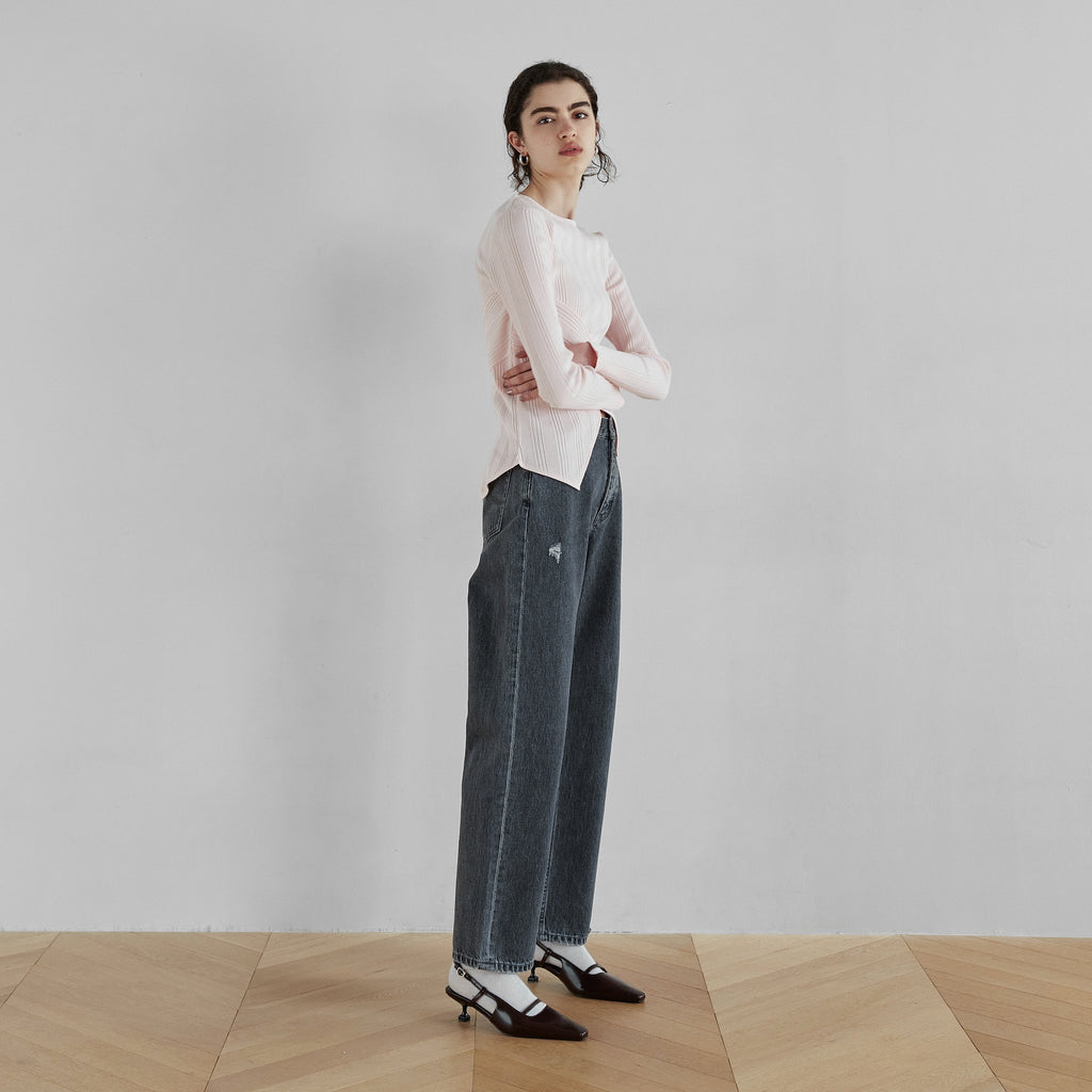 The waist is fitted, but the rise is shallow, and the hem is a loose straight cut that falls straight down. The silhouette is particularly beautiful when viewed from the side. The design point is the slit on the inside of one hem and the distressed hem on the other hem.