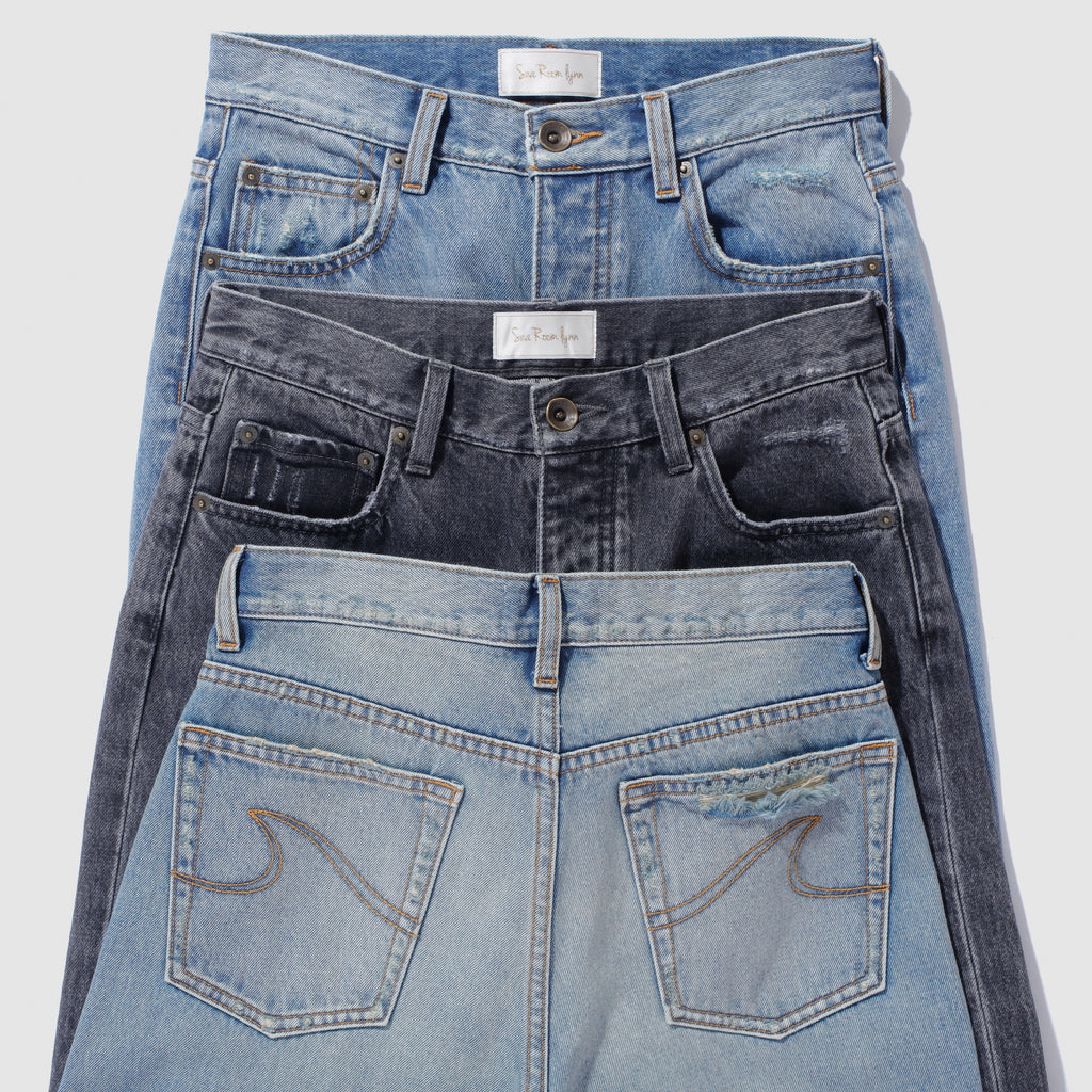 The two blue colors are 12.5oz denim with a smooth touch. The fabric has a beautiful appearance, characterized by three-dimensional grain and vertical fading. "Vintage Blue" is a special color with a yellowish tint to emphasize the used look. "Aging Blue" is based on a processing method that resembles old clothes, and has a unique used look with a stronger yellowish tint. Although the color is strong, it has been adjusted to maintain a clean look. "Washed Gray" has black warp threads and white weft threads. It expresses the worn look of repeated wearing and washing.