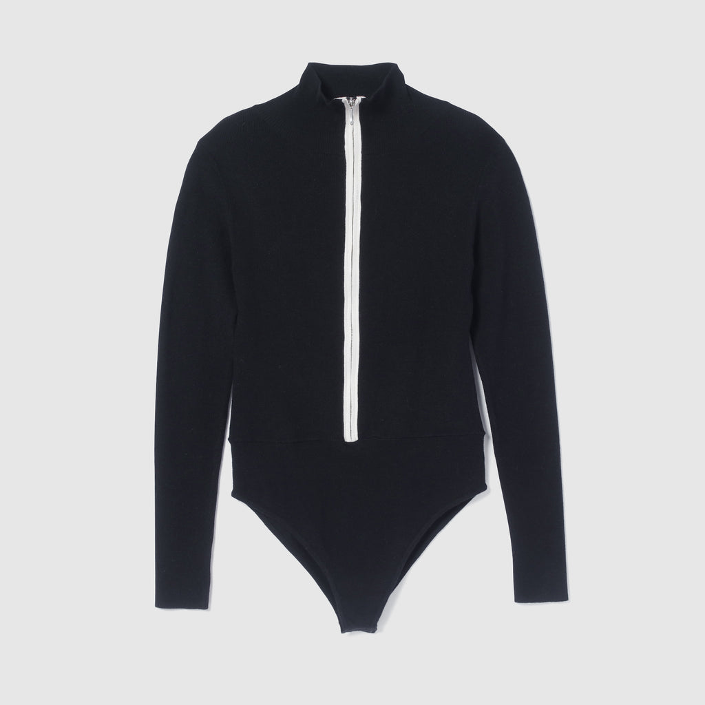 A two-tone bodysuit made of soft, stretchy rayon with fine ribbing.