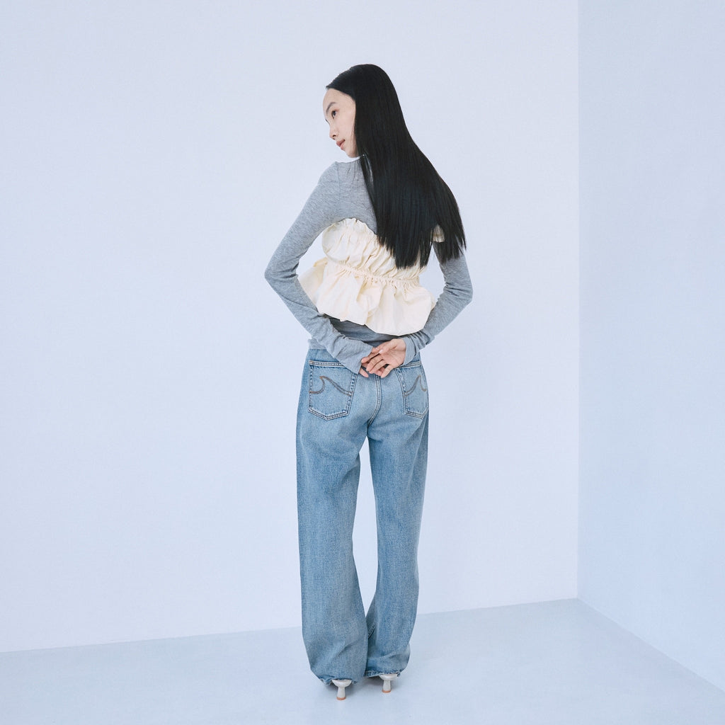 【オーガニックの優しい風合い】定番生地と同じ 12.5oz(オンス)でも、質感が異なり、よりデニムらしいワイルドな見た目が特徴です。定番生地には細い糸の密度を上げて生地の厚みを出しますが、今回の生地はもともと糸が太く、糸自体の柔らかさと密度を調整することでバランスを取り、同じオンスに仕上げています。しっかりとした生地感でありながら、オーガニックコットンの膨らみが感じられ、着心地も柔らかです。