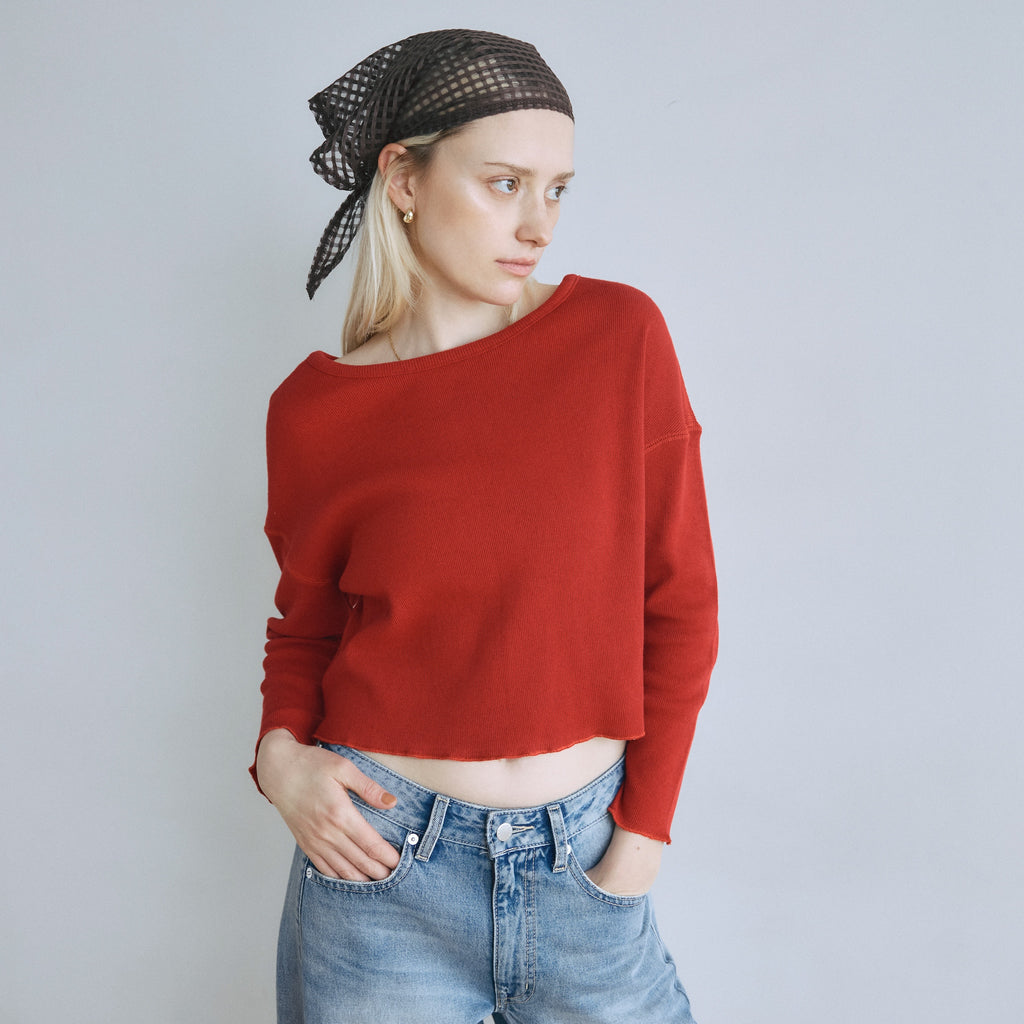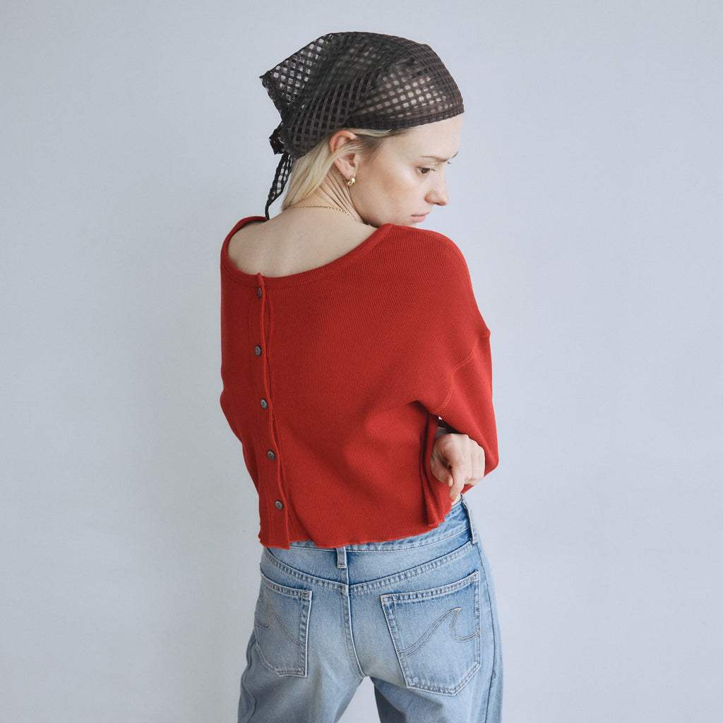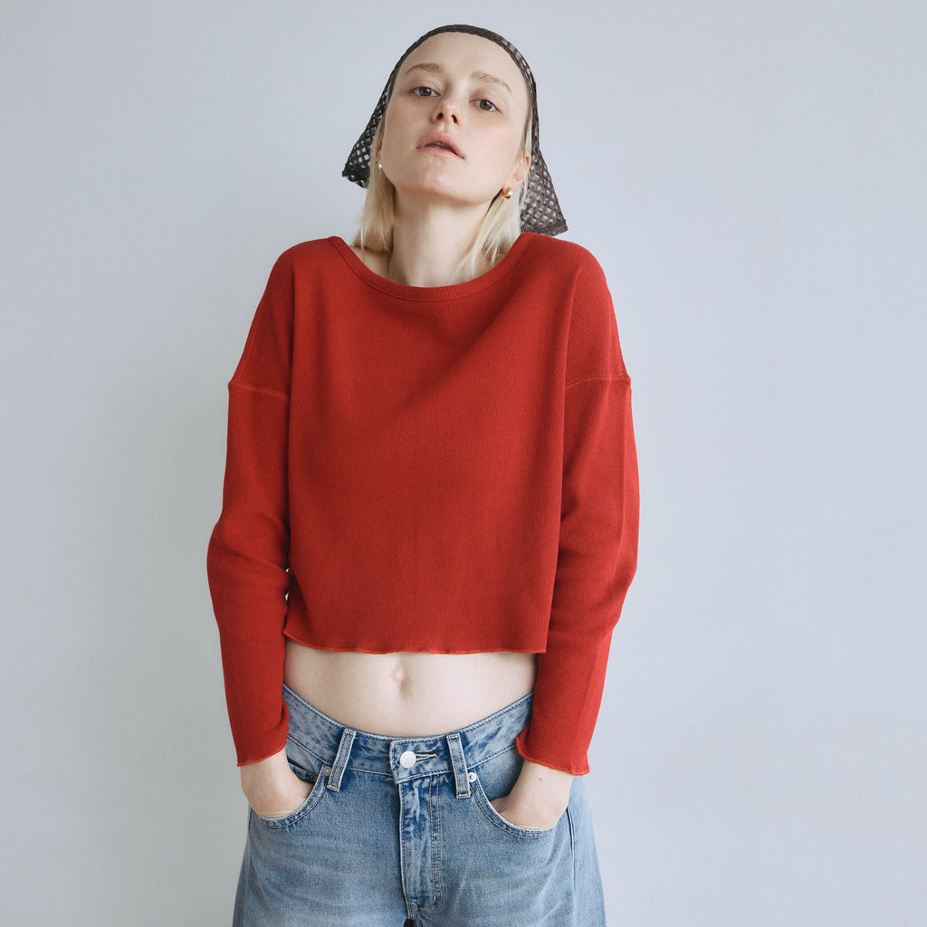 【計算されたコンパクトフォルム】バストが幅広いコンパクトなフォルムが可愛いポイント。腕はゆるすぎないジャストな着用感にしています。重ね着した時に肩紐がチラリと見えるよう、ネックを広めに設計しました。